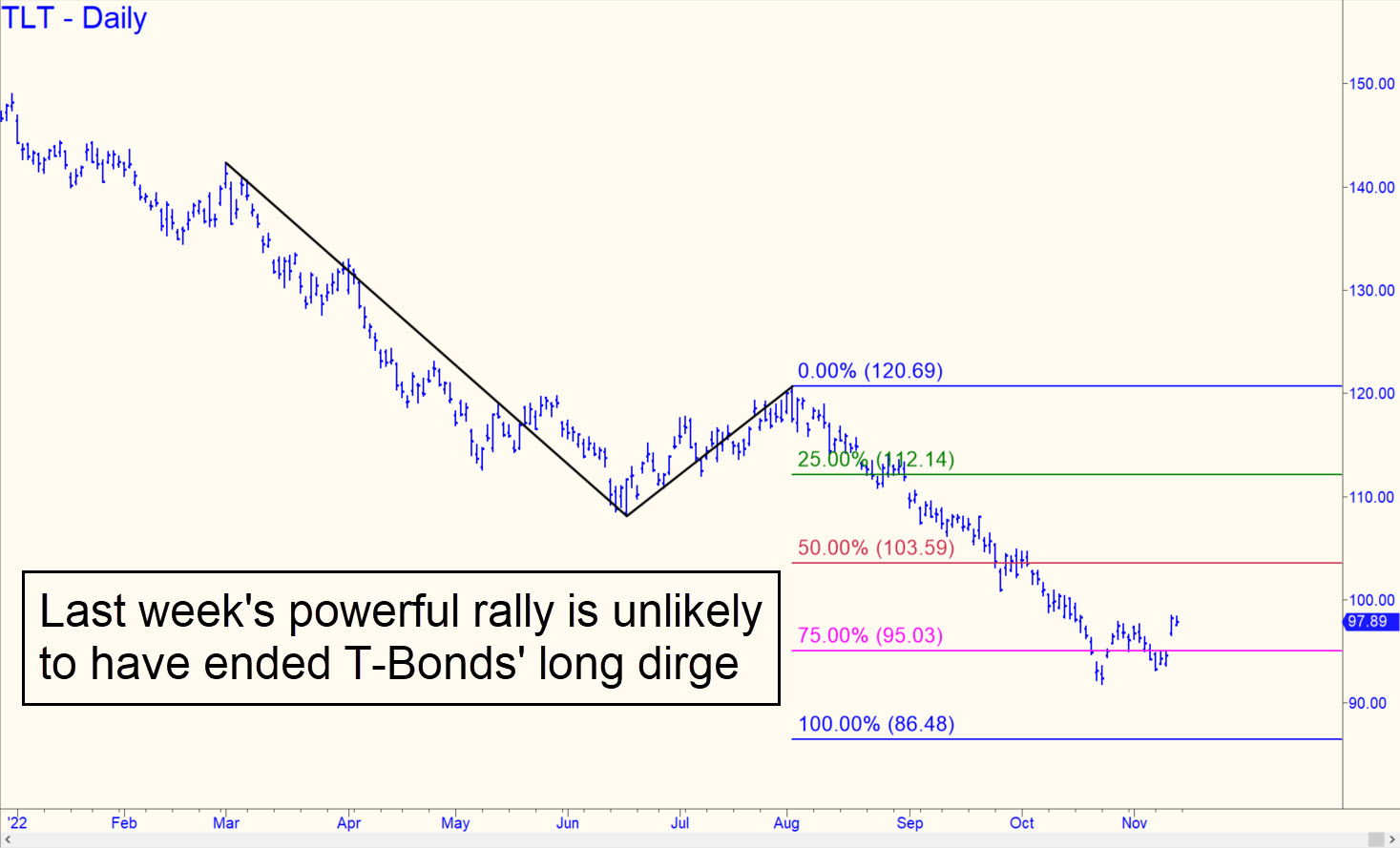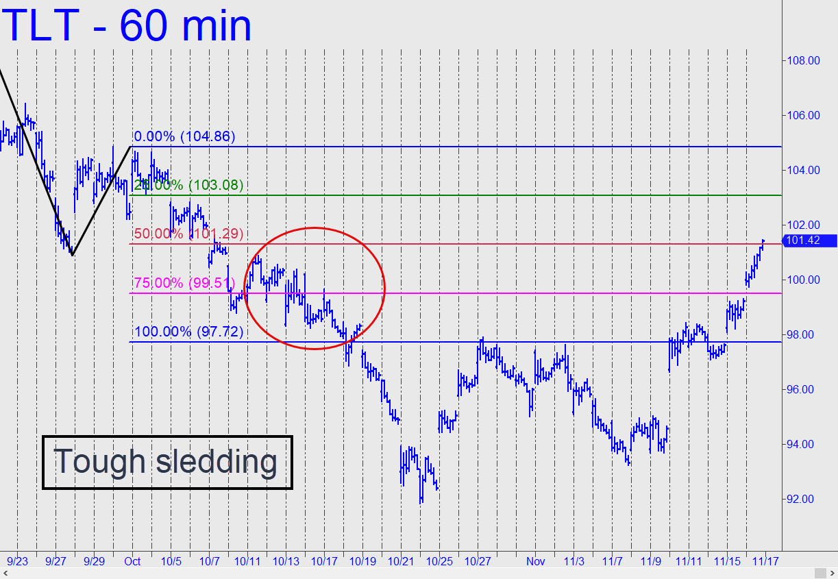 Last week’s rally, powerful as it was, seems unlikely to mark the end of the long and all but relentless dirge in Treasury Bonds. The uptrend would need to continue to 100.91, surpassing a small but technically significant ‘external’ peak recorded on October 11, in order to generate an impulse leg on the daily chart. It would be the first such signal since August, but obviously no guarantee of higher prices. For now, we’ll assume that if and when this vehicle relapses, it will be bound for the 86.48 target shown in the chart. _______ UPDATE (Nov 16, 9:55 p.m.): Buyers pushed past a series of external peaks effortlessly, bolstering the case that a major bull move is under way. The next significant obstacle lies at 104.86, where an important high was recorded on Sep 30.