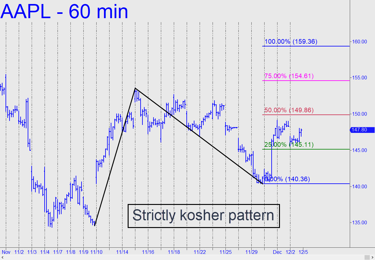 The bullish pattern shown, which projects an 8% rally to 159.36 over the near term, lacks only a fist-pump through the midpoint pivot at 149.86 to make the finishing stroke n odds-on bet. AAPL’s timidity is understandable, since the stock hasn’t been strong enough to lead the broad averages higher when they are tired. That’s because sales of pricey iPhones are facing simultaneous recessions in China, Europe and the U.S. Even so, as my quite bullish outlook for the S&Ps implies, AAPL is headed higher come hell or high water. The pattern shown looks promising for risk-averse trading on the way up, particularly on a pullback to the green line from our sweet spot just above 152. ______ UPDATE (Dec 5, 4:51 p.m.): AAPL did in fact thrust above 149.86, albeit only fleetingly in a move criminally engineered by the Ivy-educated thugs who control the stock. The equally sharp pullback has so far missed touching the green line by 26 cents, but when this happens, the stock would become a ‘mechanical’ buy, stop 140.35. _______ UPDATE (Dec 6, 8:14 p.m.): The ‘mechanical’ trade triggered, then proceeded to go underwater for the rest of the session. The pattern was a good one to gamble on, but if it fails to make money, I’d have to conclude the stock is in more trouble than I’d imagined. It’s going to be increasingly challenging for its handlers to distribute to suckers as recession begins to tighten on iPhone sales around the world.