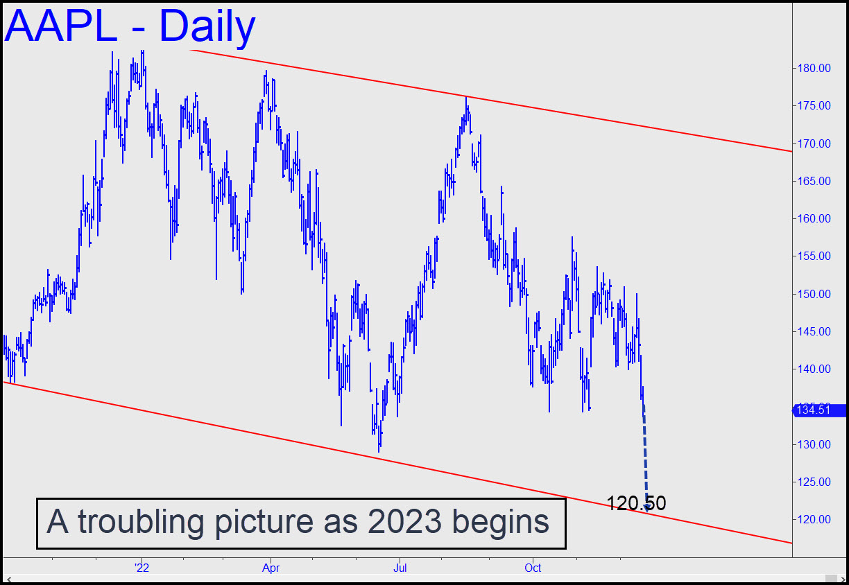 The modest bear market rally begun in October likely ended last week when stocks turned sharply lower after failing to achieve clear ‘Hidden Pivot’ rally targets. Now, if the selling should continue to exceed minor abcd targets as occurred last week, that would affirm that Papa Bear is back. AAPL in particular, the world’s most valuable stock, took a dive that has another 10% to go before good support is likely to materialize near $120 (see chart, above).