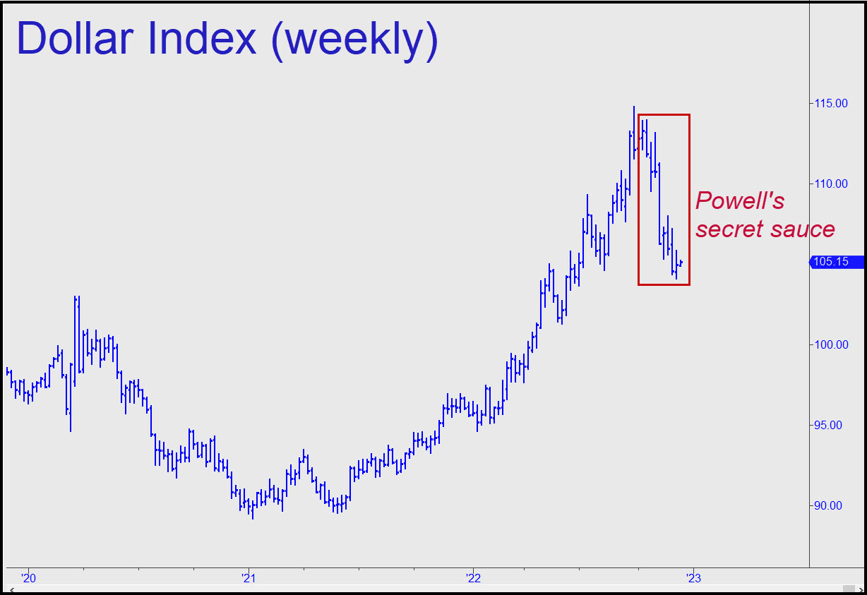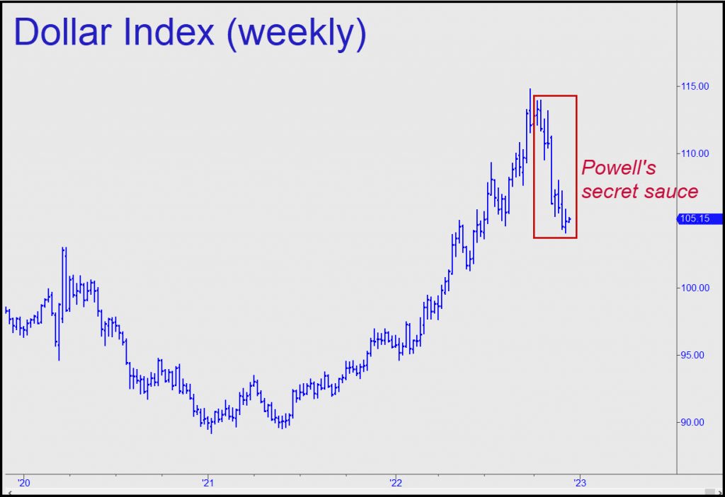 Does a world that produces a mere $100 trillion in real goods and services need a financial edifice more than 20 times that size to provide capital? Clearly, the primary business of planet Earth, far and away, is shuffling paper. For Bloomberg and others to assert that a hawkish Fed has successfully avoided the implosion of a multi-quadrillion-dollar debt bomb is like saying an intrepid flea navigating the circumference of a black hole has experienced just a small tug so far. That the dollar strengthened as Powell & Co. were loosening promiscuously should tell you that it is not eggheads who have been controlling its value, but rather, market forces far more powerful and, ultimately, irresistible.