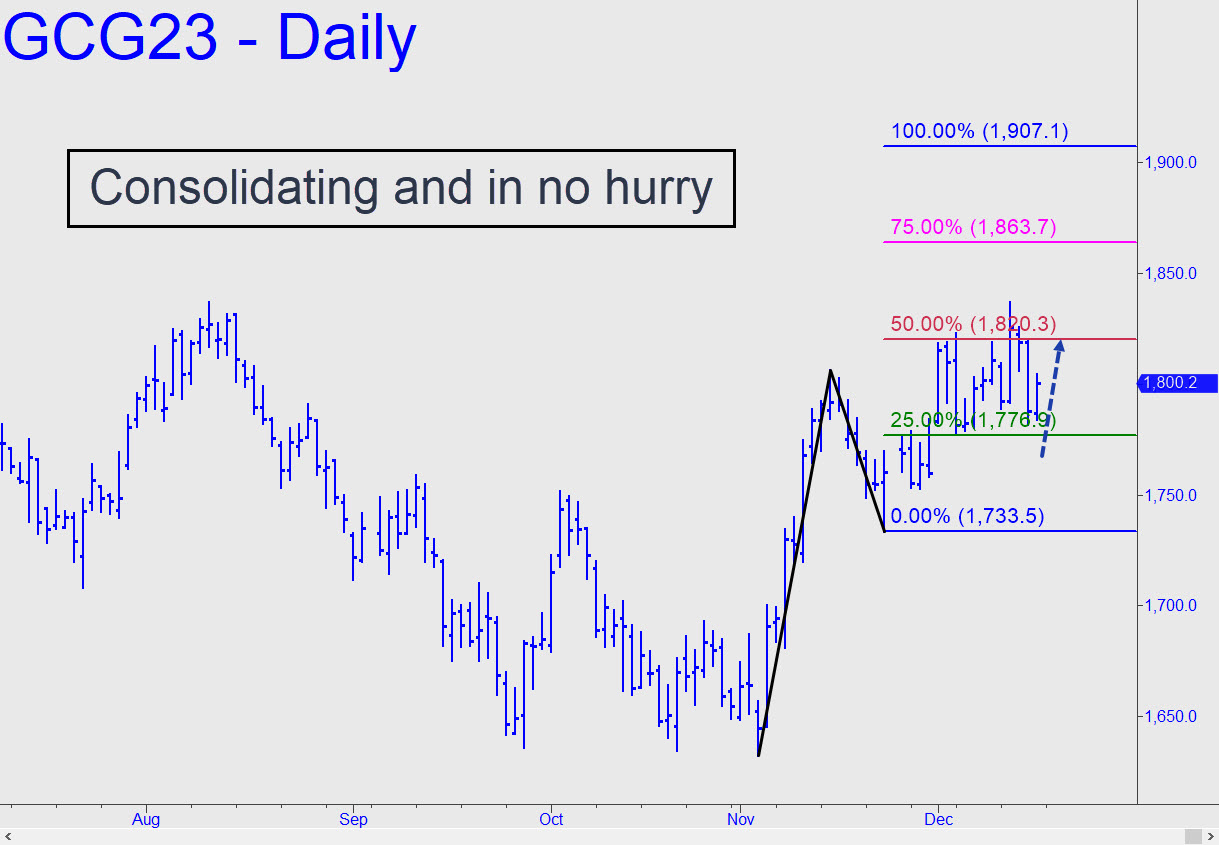 Nearly three weeks of consolidation may have doused the flames from November’s volcanic eruption, but the labored ups and downs over that period haven’t diminished the odds that the next bull leg will hit 1907.10. The target, a Hidden Pivot resistance of daily-chart degree, is shown in the inset. It became no worse than an even-odds bet to be reached last week when the futures briefly poked above the midpoint resistance (p) at 1820.30. They subsequently missed triggering a mechanical buy at the green line (x-1776.90), but the trade will still be viable when trading resumes Sunday evening. With implied entry risk of around $17,000 on four contracts, this one is for subscribers who know how to cut that to $1500 or less using ‘camouflage’. The green line should not be construed as a support or a target; it is just a reference point we use to do certain types of trades. _______ UPDATE (Dec 23): The ‘mechanical’ buy at 1776.90 noted above is still valid and carries the same caveats. _______ UPDATE (Dec 27, 10:27 p.m.): The C-D leg has become so labored and punitive that I am no longer recommending a ‘mechanical’ buy on a pullback to x. The 1907.10 target remains theoretically viable nonetheless.