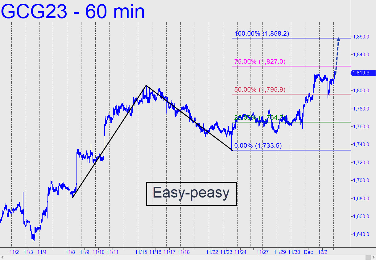 The February Comex contract ended the week with an effortless upswing that fell a tad shy of the pink line, a p2 secondary Hidden Pivot at 1827.00. Assuming the confidence of buyers hasn’t diminished over the weekend, we should expect them to reach the 1858.20 D target by no later than midweek. A pullback in the meantime to the red line (p=1795.90) would trigger a ‘mechanical’ buy, stop 1775.10, that could be traded using an impulsive ‘camouflage’ trigger on the 5-minute chart. ______ UPDATE (Dec 5, 4:23 p.m.): The gratuitous viciousness of today’s selloff is telling us that too many were too bullish when the day began. The ‘mechanical’ trade would be $6400 in the red if done conventionally (not recommended), although the position has so far avoided getting stopped out by a heart-stopping $3. A less risky ‘mechanical’ buy would trigger at the green line (x=1764.70), but I would suggest this only for subscribers with the Hidden Pivot chops to cut the risk down to no more than $1,200 or so (on four contracts).
