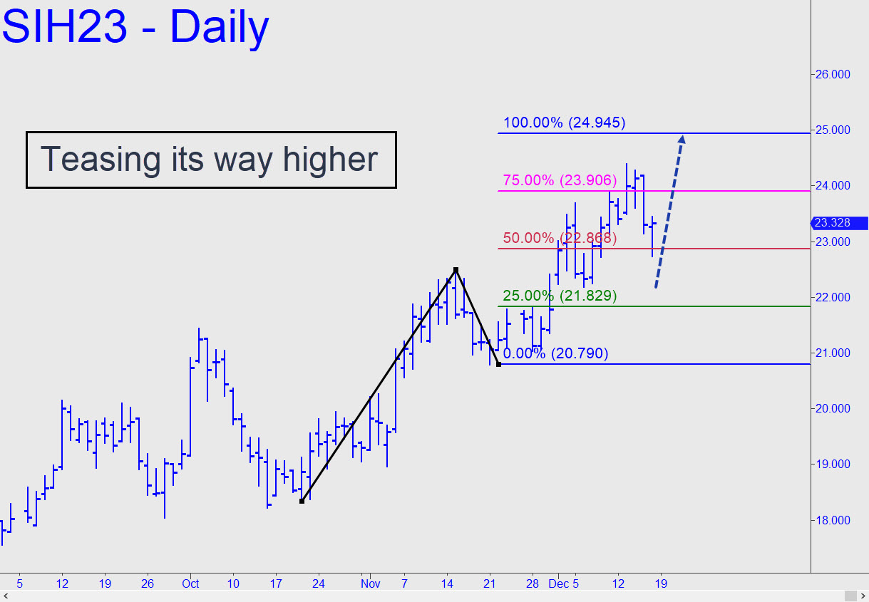 There is more enthusiasm pushing silver than gold, although both are likely to hit their respective ‘D’ targets more or less simultaneously. (March Silver’s lies at 24.95.) That makes a ‘mechanical’ buy at the red line (p=22.86) somewhat riskier, since the required stop-loss at 22.16 might tempt silver’s handlers to drift their way down to it if gold’s sluggish behavior continues. A scarier plunge to the green line (x=21.83) would paradoxically offer a better ‘mechanical’ buying opportunity, but we should plan on initiating the trade with a ‘camouflage’ trigger so that the implied entry risk, which would exceed $20,000 on four contracts, is not so terrifying. _______ UPDATE (Dec 23): The futures made a marginal new high last week that fell 42 cents short of my 24.94 target. It remains valid nonetheless and can be played via a ‘mechanical’ buy at the red line (22.86), stop 22.17. Nudge me in the chat room for real-tie guidance that can help cut entry risk by 90% or more.