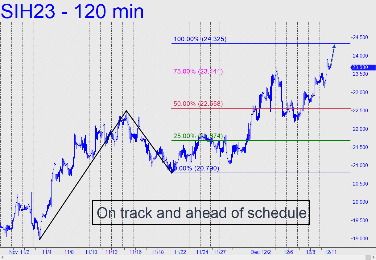 March Silver has risen with more self-assurance than gold recently and lies within easy distance of a 24.32 target that has kept us comfortably on the right side of the trend, even during the 6% selloff that began the week. The target is derived from an ABCD pattern sufficiently clear and compelling to offer a high-odds short. Regardless, bulls should keep their fingers crossed, since an easy move through the target, especially if accompanied by a close above it on the same day, would add to the evidence that September’s low at 17.56 was the start of a bull market. Above 24.32, our next price objective would be 25.06 (weekly chart, A= 18.23 on 10/14).