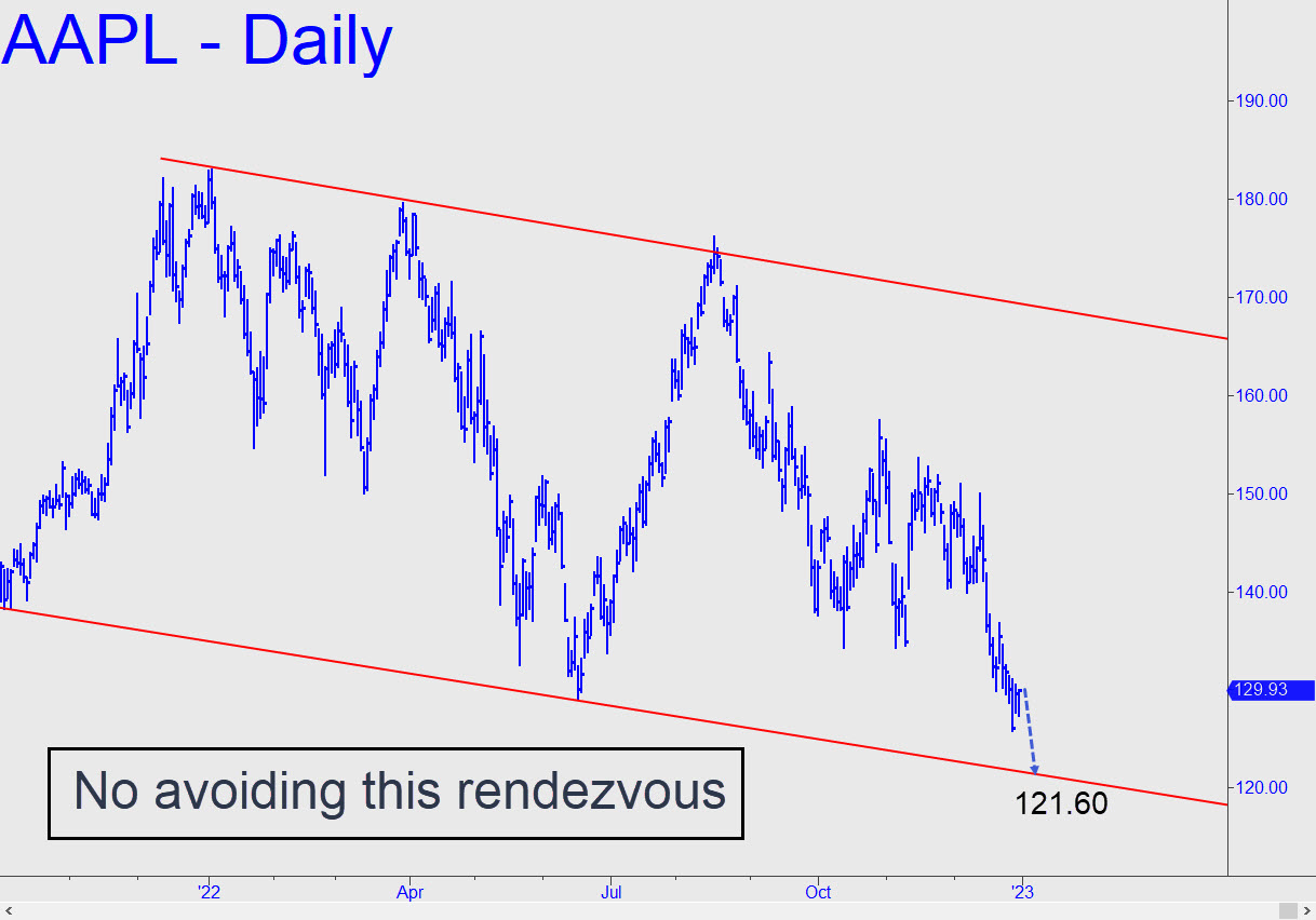 A fall to at least 121.60 early in the new year still looks inevitable. That’s not a Hidden Pivot target, but rather a closely measured approximation of where the trendline will be at the end of this week. We’ll look to bottom-fish using a small-degree reverse pattern (rABC) when the stock gets there. However, given the compelling clarity of the channel lines, if the bounce were to peter out quickly, that would be ominous. Although my long-term forecast sees AAPL eventually falling to $50 or lower, I don’t see this happening any time soon.