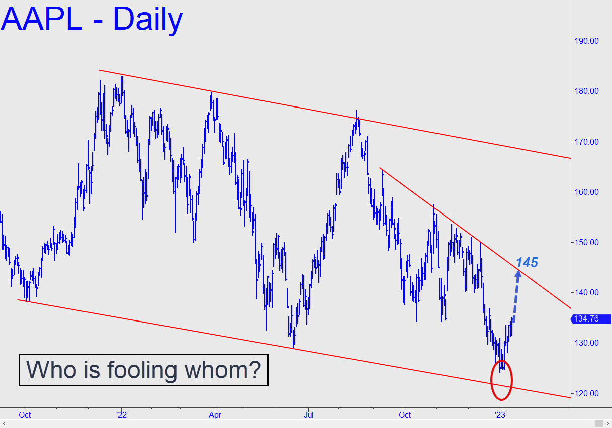 AAPL’s sucker rally has come from a technically inconvenient place somewhat above an authoritative trendline, but this only mildly diminishes the likelihood the stock will revisit the lows and test them unsuccessfully enough to reach the line. In the meantime, though, we should be ready to exploit a rally to around 145, where a second trendline with presumptive stopping power comes in. More immediately, the hourly chart says full speed ahead to at least 136.77 (A=124.76 on Jan 5) over the near term. You can short there with a vertical put spread expiring within 4-9 days, but check the chat room for more-specific guidance if the opportunity looks close. ______ UPDATE (January 17, 10:35 p.m. EST): Subscribers reported buying the Jan 20 132/130 put spread for around 0.20. For now, offer half of them for 0.45, good-till-canceled.