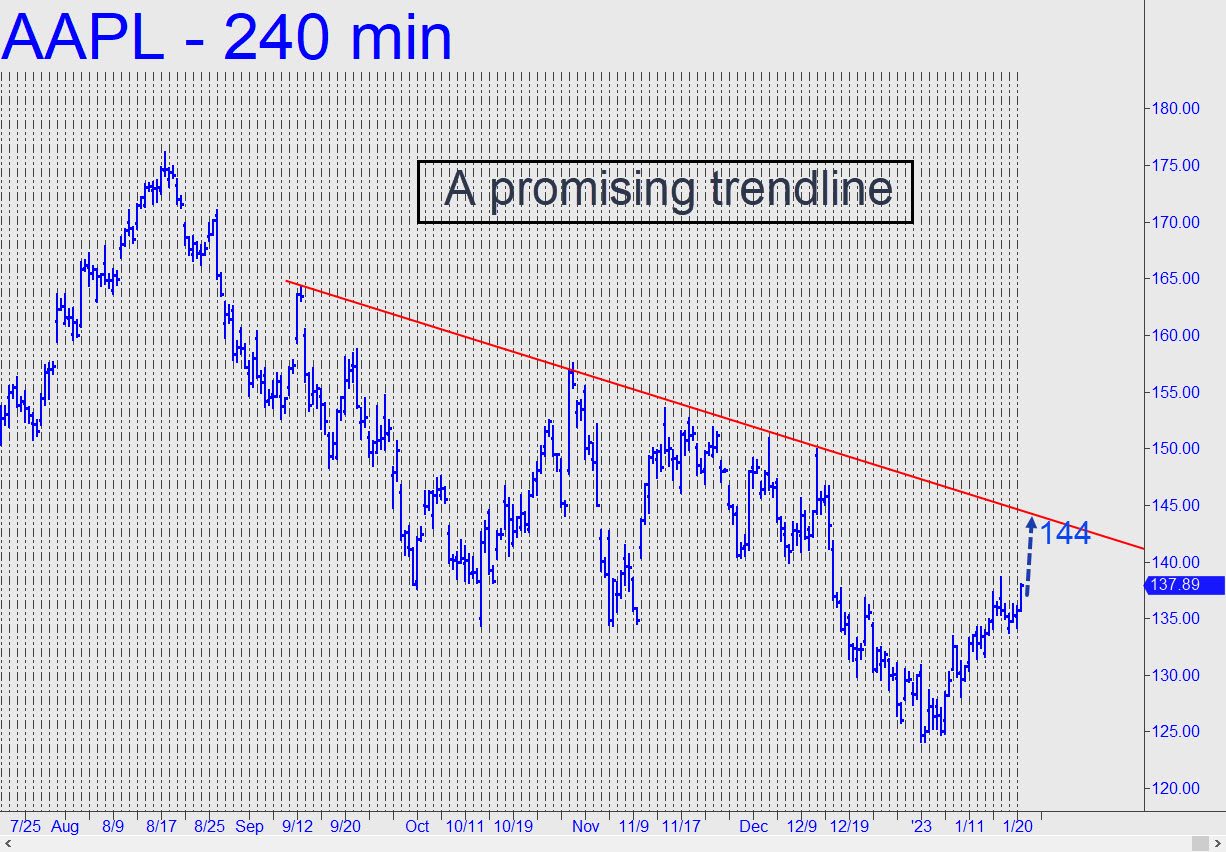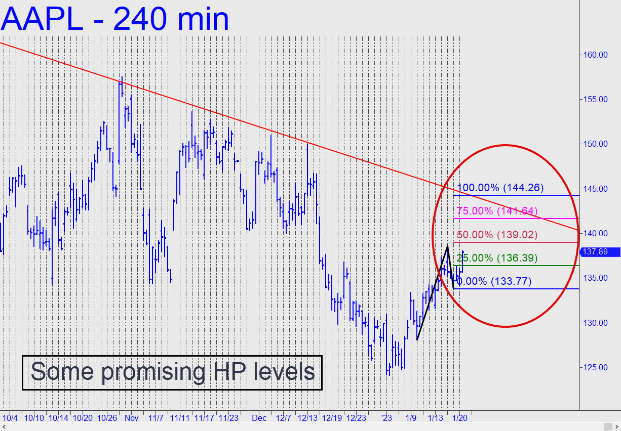 Our bellwether of bellwethers, the only stock that matters, has ample headroom to generate plenty of bullish buzz en route to the trendline shown (inset). If it were to be hit within seven or so trading days, that would occur at around 144.28, give or take perhaps a dime. My gut says there is a better chance AAPL will fail to reach the line than overshoot it, but we’ll suppress such thoughts and rely on price action alone to provide trading opportunities as they occur. Here’s a perspective to make the task easier — one that looks capable of yielding some juicy ‘mechanical’ buys if we should get a nasty pullback or two on the way up. ______ UPDATE (Jan 23, 8:51): DaBoyz goosed AAPL into a spasm that nearly reached the trendline in mere hours, not the 5-7 days I’d estimated. Let’s try to get short near the trendline if the rally resumes: Today only, if the stock is trading for 144.10 or less, bid 0.45 for four 27 Jan 140 puts. You can take up to 0.04 discretion (i.e., pay up to 0.50) as long as your bid does not exceed the mid-price of the option’s bid/asked. _______ UPDATE (Jan 24, 7:36 p.m.): Bid 0.32 for the puts today, day order, same conditions but with no discretion on price. If you buy them, immediately offer half for 0.65, g-t-c. This is a longshot bet but hardly farfetched. _______ UPDATE (Jan 26, 1:11 p.m.): AAPL topped on an opening-bar short-squeeze a penny from the current target and three cents from the trendline I’ve been headlining for the last few weeks. The latter was an estimate, but the result was sharpened by two cents using the minor ABCD pattern shown here. I’ve been too busy to stay on top of the put trade, which I adjusted twice. Although the 140 puts I suggested initially were no longer playable because of time constraints, the 142s went from 0.41 yesterday to a high of 2.68 today. There appears to be almost no interest in trading AAPL, but I’m not keen on taking it off the sheets, since the stock remains a perfect bellwether for reading the stock market correctly. If I were to remove AAPL, I could substitute a symbol of more interest to subscribers. See my comments in the chat room concerning addiction to option trading.
