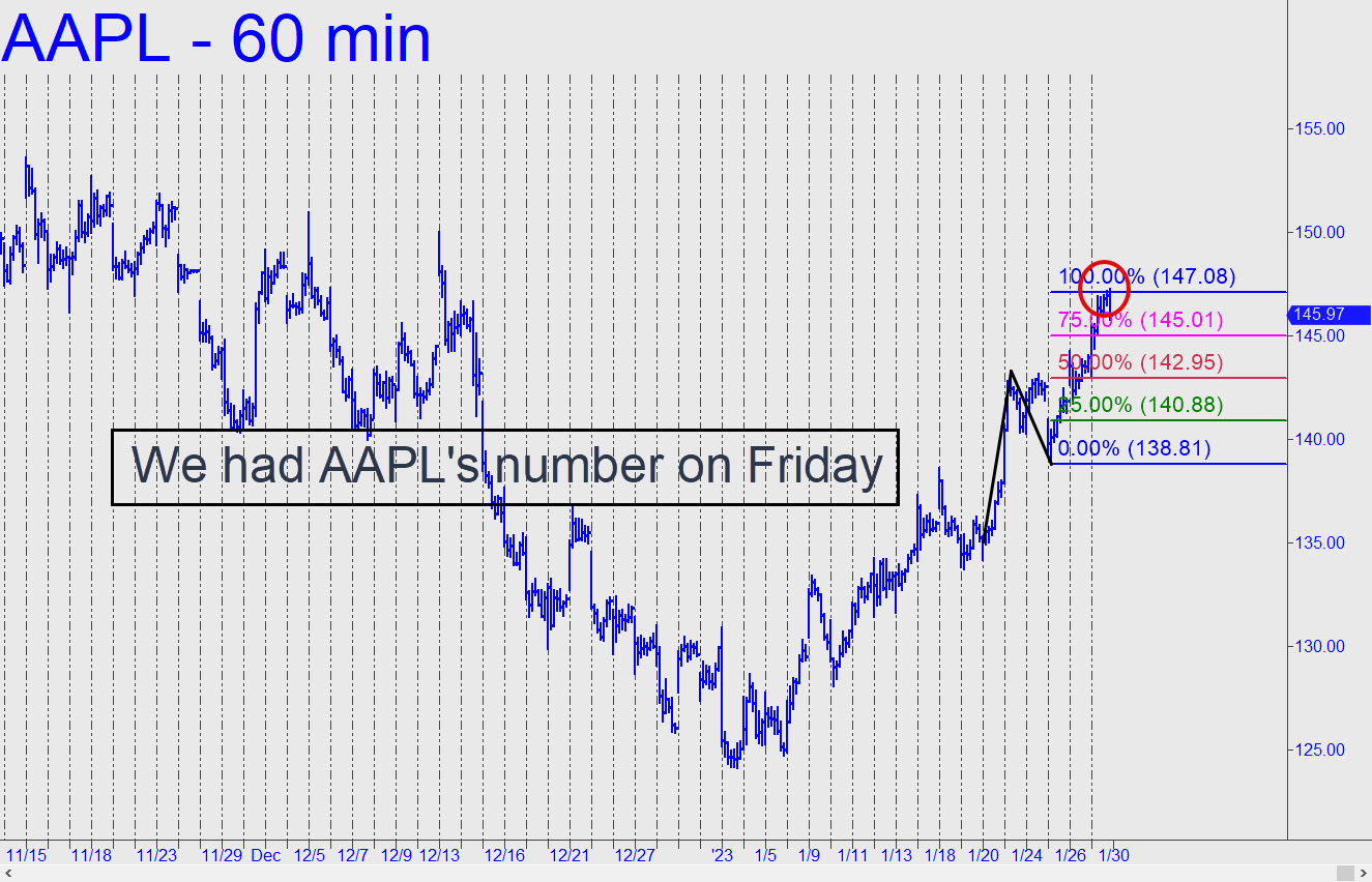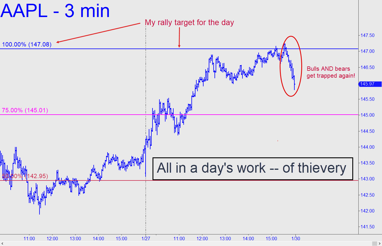 We had AAPL’s number on Friday, allowing all you option junkies to get short with puts just a hair off the top. Don’t count your chickens, though, even if a nimble subscriber reported a quick, $600 profit in the final minutes. The finale featured a panic-induced short-squeeze to slightly above the day’s previous peak, then a collapse cleverly timed so that it wouldn’t have enough time to snowball and cause real damage. Here’s what the end-of-day plunge looked like on the lesser charts: a mash-up of AAPL’s weaselly sponsors and little guys who never give up on the challenge of beating them at their stupid, nasty little game.