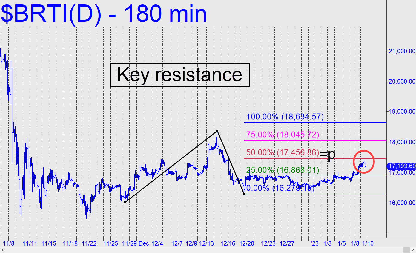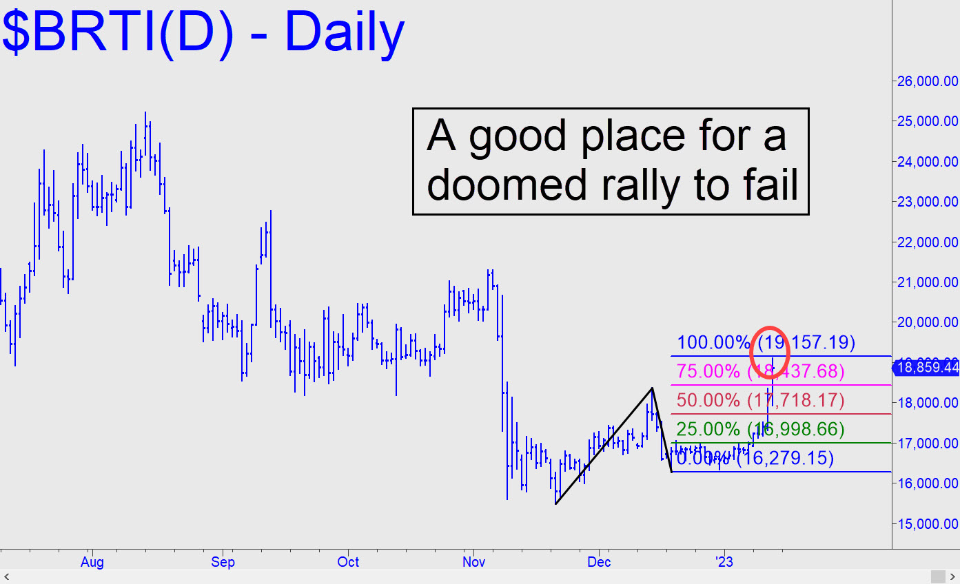 The chart shows what can happen when the so-called smart money gets trapped. Given the unnaturally tight trading range that bitcoin’s deft conspirators have maintained for nearly two months, one might believe they are capable of holding the cryptocurrency above $15,000 indefinitely. Unfortunately for them, the chart is telegraphing a fall to at least 11,484. Bitcoin’s deep-pocketed sponsors undoubtedly have been hoping to be rescued by a powerful short-squeeze, but this is looking increasingly unlikely to materialize from these levels. As ‘Trader Mike’ Schurr likes to remind us in the chat room, hope is not a strategy. The smart guys will have a better chance of propagating a short-covering panic if they allow more slippage, however painful, to the 11,484 Hidden Pivot. Even then, the reaction move would be limited by mountainous supply above $25,000 from players whose cost basis is at least twice that. More likely, in the context of an intensifying bear market in stocks that could run for years, is a washout that threatens to take bitcoin down to $5000 or lower. ______ UPDATE (Jan 9, 5:43 p.m.): Today’s volumeless waft just missed touching an important midpoint Hidden Pivot at 17,456. Buyers will need to pulverize it, however, to demonstrate their seriousness and ability to reach D=18,634. _______ UPDATE (Jan 12, 11:39 p.m.): Bertie’s doomed rally topped in an obvious spot, at the 19157 D target of this pattern, It is into serious supply now, so we shouldn’t expect today’s Whoopee Cushion squeeze to continue much higher.