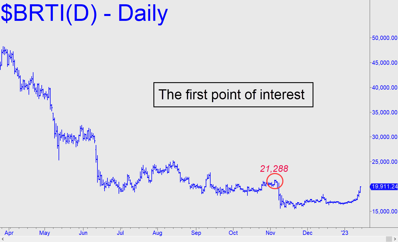 This doomed short squeeze will face no challenge until it hits the 21,288 ‘external’ peak shown. The rally probably has enough momentum to get past it, but that would do little to allay my skepticism that Bertie is going anywhere. A ‘voodoo number just above 22,000 is where we might try to get short, via an rABC trigger that would risk perhaps 10-15 points on a stop-loss. However, if buyers get past that level easily, they would likely be on their way to 24,000, another place where we can attempt to get short with a penny-ante stop-loss. Stay tuned to the chat room or ‘Notifications’ for more-precise guidance if an opportunity should arise. ______ UPDATE (Jan 18): Bitcoin’s unsustainably steep bear rally is rumored to have been driven by sovereign demand from the U.S., Canada and the Philippines to meet the ransom demands of whoever hacked their air traffic systems recently. This can’t end well.