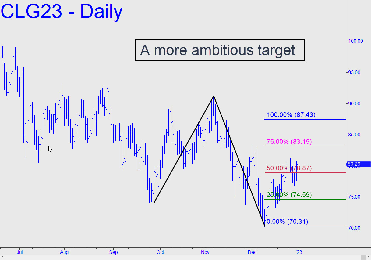 Bulls have so boldly ignored the deepening global recession that I’ve switched to a bigger ‘reverse’ pattern with a higher rally target at 87.43. Don’t expect the March contract to get there any time soon, though, since it has already spent more than a week head-butting a midpoint Hidden Pivot resistance at 78.87. In the meantime, a sharp relapse to the green line (x=74.59) should be used to get long with a ‘mechanical’ bid, stop 70.31. This one’s for subscribers who know how to cut entry risk down to size by using a micro-pattern to initiate the trade. This is what we call ‘camouflage’ trading, and it is much easier than you might imagine. Ask in the chat room if you’re curious. _______ UPDATE (Jan 4, 7:16 p.m.): In the chat room today I suggested buying 13th Jan 67.5-70.0 vertical call spreads for 0.25 to 0.49, day order. However, you can bid 0.25-0.30 for them on Thursday, provided the futures are trading 73.00 or higher. Please let me know if you bought any spreads so that I can determine whether to provide a tracking position. ______ UPDATE (Jan 5, 11:45 p.m.): No one said a word, so I won’t be updating with further guidance.
