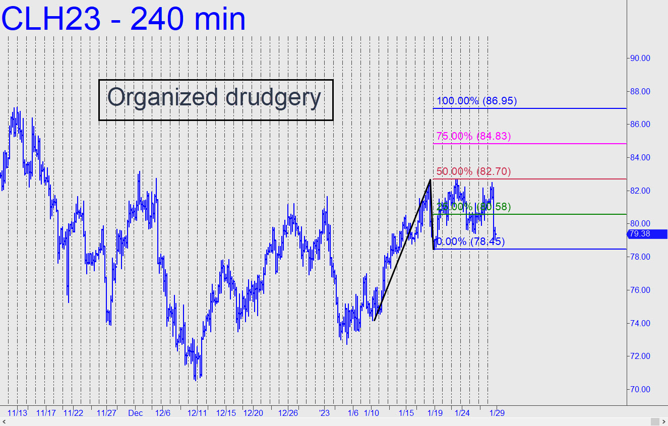 Although I track crude because it’s the world’s most important commodity, its gratuitous feints and swoons are too tiresome for me to follow closely enough for day- and swing-trading by the relative handful of subscribers who seem interested. Be that as it may, tradeable highs and lows are as easy to nail as a balsa two-by-four. Perfect opportunities do not materialize every day, but when they do they are easy to spot and work reliably. And, of course, when price action turns freakish, the task of setting up winning ‘mechanical’ trades is a piece of cake. The foregoing is not meant to discourage you, but rather the opposite. If subscribers can come up with Hidden Pivot ideas to trade this rabid mongoose, I’ll be happy to vet them. For starters, focus on the pattern shown in the chart, but after it has taken out the point ‘C’ low, 78.45, by just a few ticks, then reverses. For now I’ll highlight the 86.95 target anyway so as not to seem clueless about where this contract is headed: tortuously higher. That’s how the little sonofabitch works, but I’ll make it your job to find the opportunities. _______ UPDATE (Jan 30, 1:52 p.m.): March Crude provided precisely the opportunity this morning I had detailed above. Please check my chat room posts from this morning about this, since they describe in detail, with text and charts, how you might have proceeded. ______ UPDATE (Jan 30, 7:52 p.m.): Here’s part of my chat room post from this morning, with a chart showing a clear path down to 77.05: For all of crude’s spastic price action, it is relatively easy to read and to trade, provided you are willing to work at it. The linked chart shows the pattern that is commanding March Crude at the moment (i.e., noon Monday), notwithstanding the bozos who are causing the movement between HP levels. You can see that it generated a no-brainer ‘mechanical’ short at x=79.63 a short while ago. We’d have been out of the profitable trade from earlier by then. Yes, it is work, and it takes undiluted attention and nimble execution skills to exploit even ‘textbook’ patterns. _______ UPDATE (Jan 31, 10:26 p.m.): I’ll take a rest until someone mentions March Crude in the chat room.
