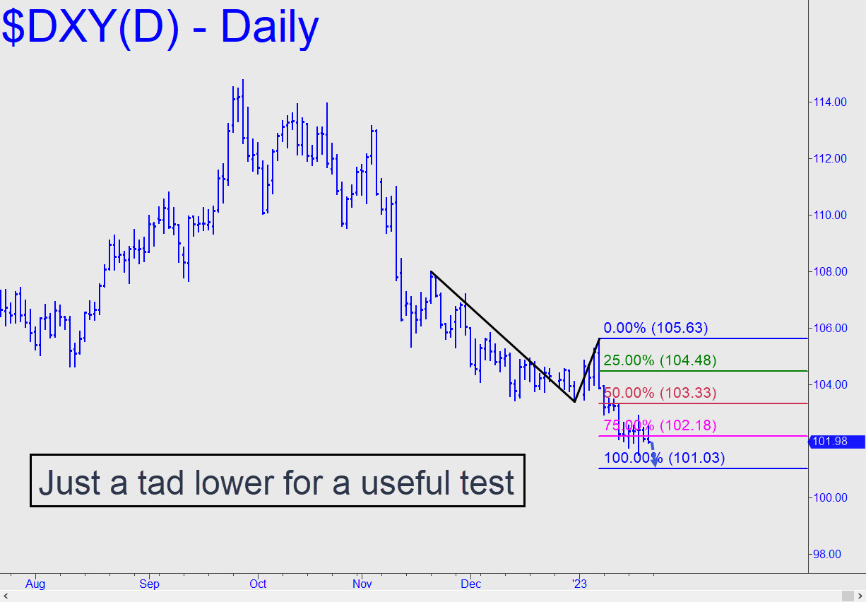 The dollar picked up no support on the way down through p=103.33, but that does not necessarily portend another failure when it reaches the ‘D’ Hidden Pivot support at 101.03. However, the seven days of distribution that have occurred since the drop from p to p2 have likely tilted the odds toward a breach of D. If a decisive one occurs, use 100.18 as a new minimum downside projection. That is the D target, on the daily chart, of A=113.15 on November 3.