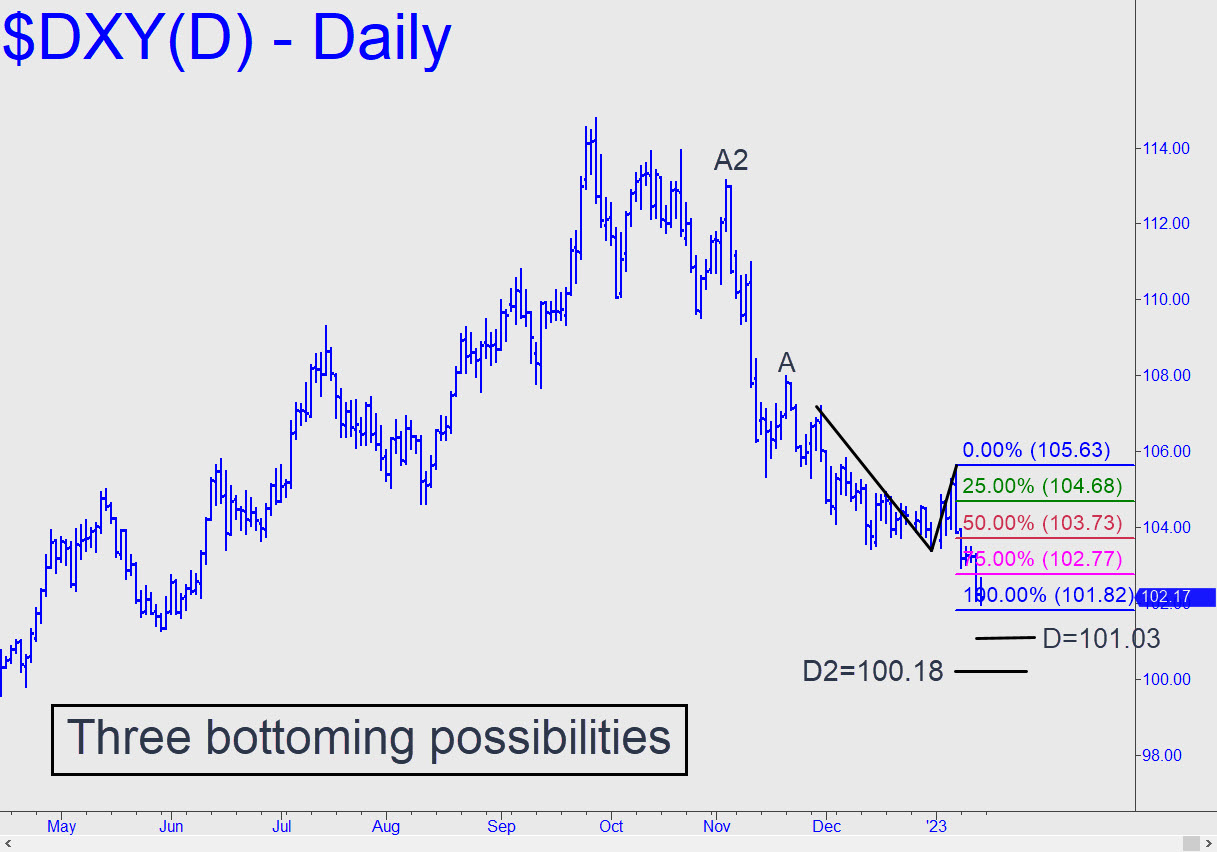 The dollar’s steep correction since late September will have three good chances to bottom in the weeks ahead, respectively at 101.82 (0.04 from Sunday’ night’s low), 101.03 or 100.18. That last Hidden Pivot support comes from the largest ABCD pattern shown in the chart (thumbnail inset) and should be familiar to those of you who have been following my Dollar Index forecasts. It seems the most likely of the three pivots to produce an important low, although the two Hidden Pivots above it will be tradeable for bounces, at least, via tightly stopped bids.