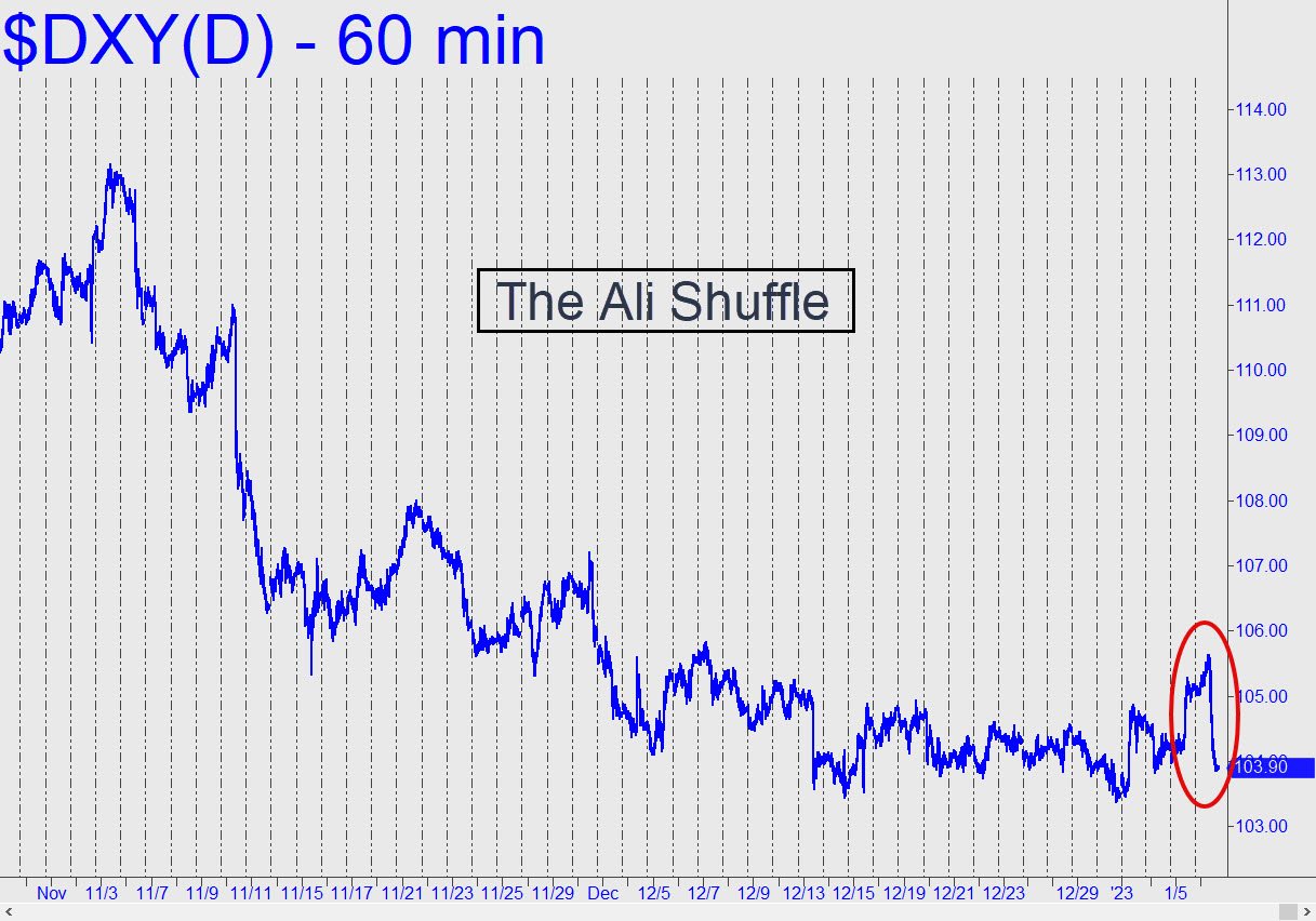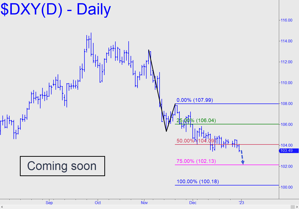 Three weeks of jitterbugging around the 104.08 midpoint Hidden Pivot support has left the Dollar Index primed for a fall to at least p2=102.13, and thence to D=100.18, a target first signaled in late November. The weakness has somewhat alleviated pressure on gold and silver and promises to contribute to their further ascent, possibly with a spike finale to an intermediate top. Presumably, it would occur above the 1908.10 peak currently forecast for the March Comex contract. ______ UPDATE (Jan 6): The Dollar Index shook us briefly out of complacency by adding an Ali Shuffle to its all-too-familiar jitterbug routine. A bull-trap rally before Friday’s opening bar reversed with such ferocity that we should infer the bearish targets above are still likely to be achieved. I’ll reconsider only if it pops above 105.81. Here’s the picture.