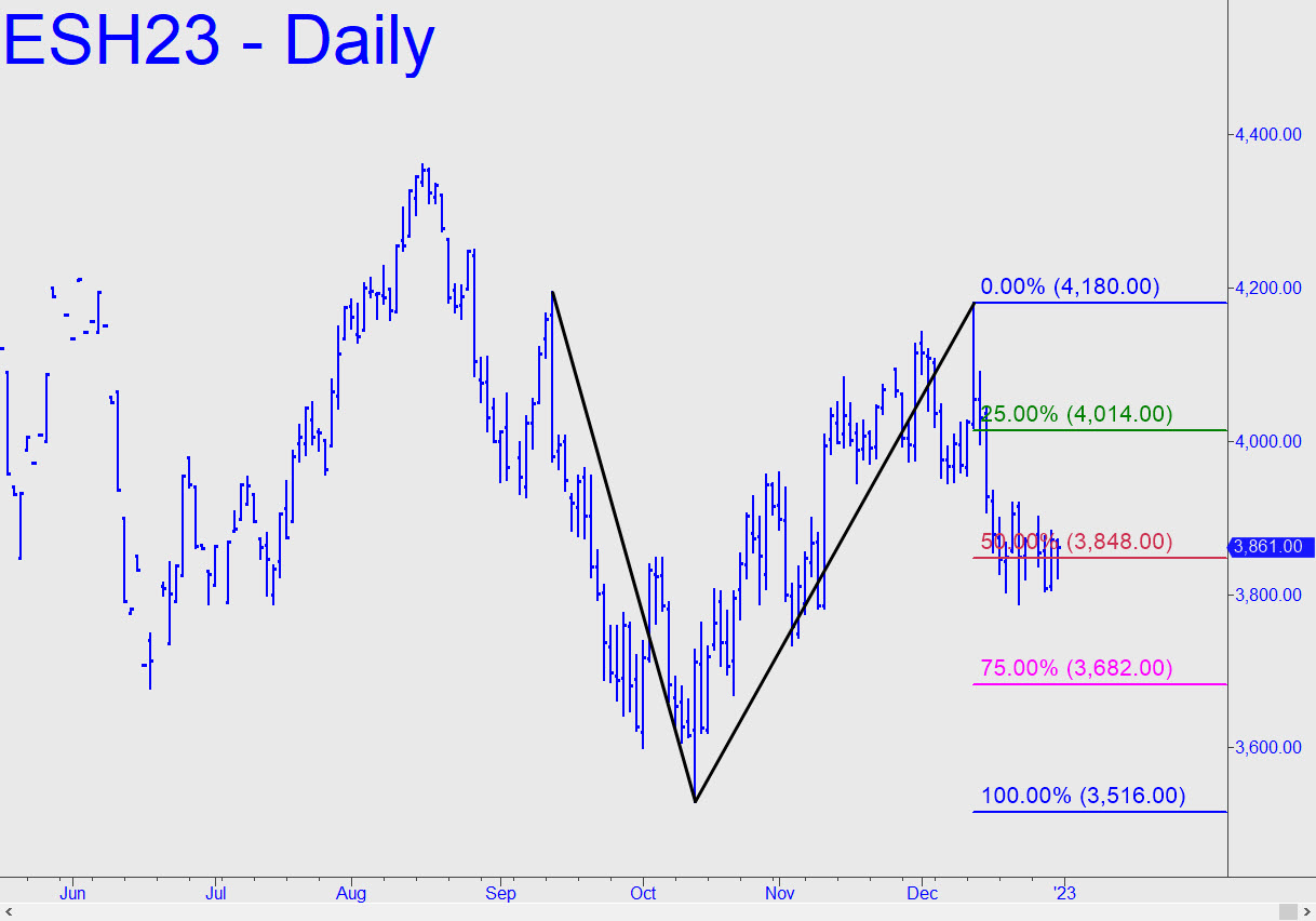 Stocks are even weaker than they appear. Notice how the E-Mini S&Ps failed to penetrate a sitting-duck trendline on their final, desperate short-squeeze lunge of the year. The broad averages are obviously marking time until DaBoyz have distributed as much stock as possible. With the U.S. recession continuing to deepen, however, they are going to have their greedy hands full trying to corral a new bunch of pigeons when trading begins in 2023. For now, we’ll stick with the 3682.00 ‘secondary’ Hidden Pivot shown in this chart as our minimum downside objective. It’s tied to a ‘D’ target at 3516.00 that is well in play but not a worst-case number for the early new year. Lower projections at 3460.00 and 3349.25 are possible using successively higher point ‘A’ peaks at, respectively, 4250.00 (8/26) and 4361.00 (8/16).