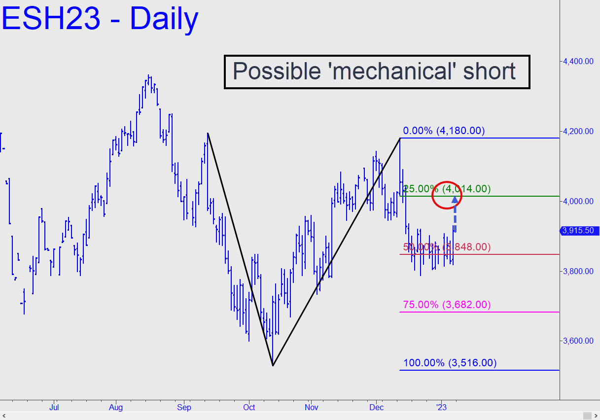 The futures spent Friday in a vicious short squeeze that itself would become short-able if it touches the green line (x=4014.00). I have my doubts the rally will get that far, but we need to take it slightly seriously anyway, since it generated an impulse leg of daily chart degree. The trade carries about $13,000 of theoretical entry risk, assuming a stop-loss at 4180.25 on four contracts. That means it should only be attempted with a ‘camouflage’ trigger. Prompt me in the chat room if ES gets there, and perhaps we will be able to improvise in real time. ______ UPDATE (Jan 12. 9:54 p.m. EST): The futures spent the entire session in full-nitwit mode, with wild swings greeting news of moderating inflation. Since no one on Earth has the foggiest idea what this means or how it might affect Fed policy, I’ll avoid wasting energy pondering such questions and simply track the short trade as having filled at 4014, stop 4180.25. This will be a good test of a ‘mechanical’ entries that came from an explicitly detailed recommendation. Since the trade caught a 66-point downdraft to 3954 after the futures topped at 4020, I’ll treat the short as having been half-covered at a middling 3974. That leaves us with two contracts and a 4054 basis. Let me know in the chat room how you handled the trade, since that might allow me to tighten my guidance. For now, bid 3950 to cover a third contract, o-c-o with a stop-loss on both of the remaining contracts at 4022.