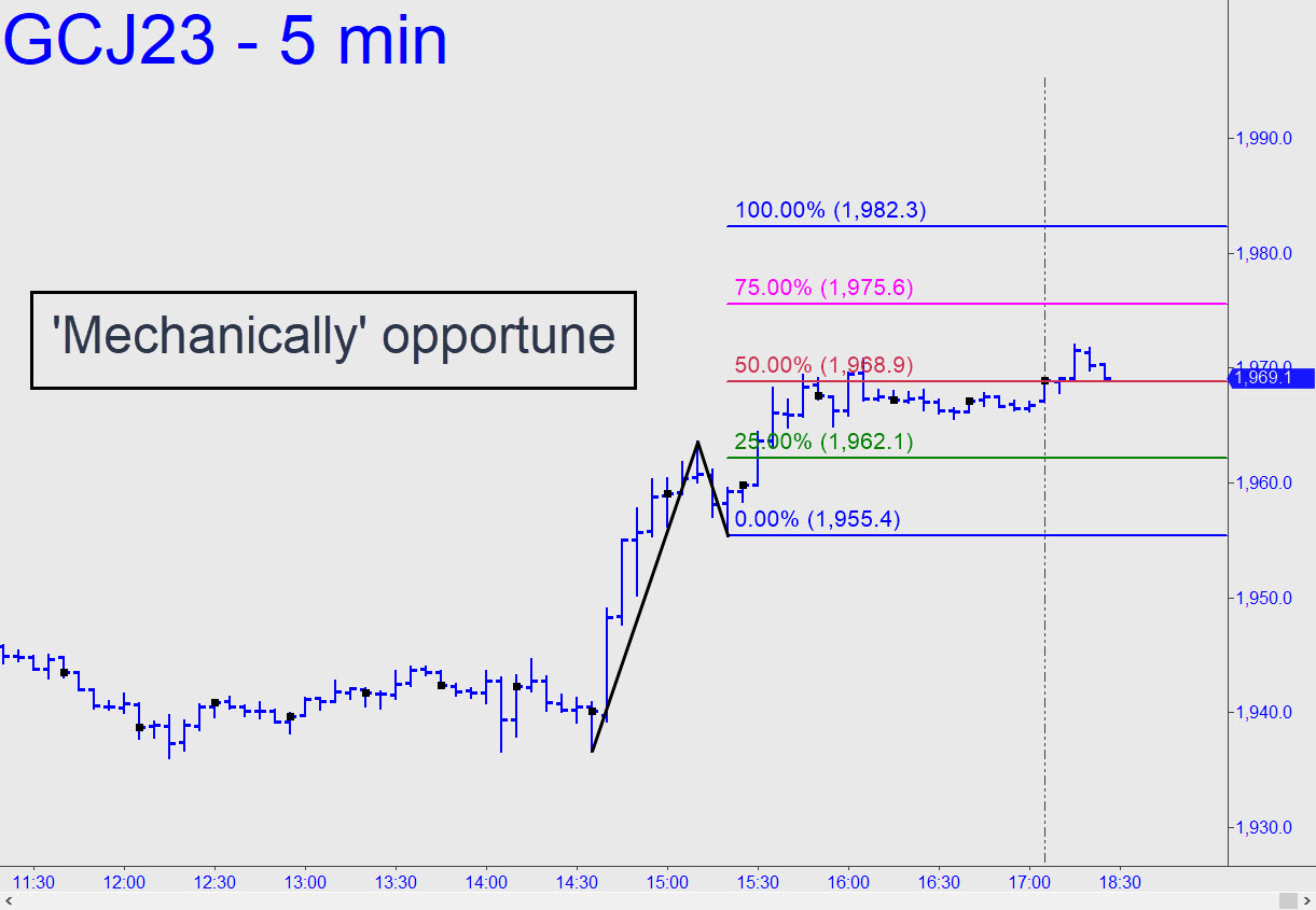 I still think this is the pattern that will usher gold futures above $2,000 for the fist time since since April — just not on our schedule. It did nothing as the week ended to monetize the ‘mechanical’ buy triggered on Thursday, although the position was showing a slight gain at the closing bell. I cannot ‘guarantee’ D=2017.70 will be reached, since buying died precisely at the 1966.60 midpoint Hidden Pivot resistanceĀ (p was a decent speculative short, actually, for subscribers who trade this vehicle aggressively). If the futures dip below the green line and you hold no position, try bottom fishing at 1921.2 with a stop-loss at 1920.80. This is a speculative play based on the 60-minute chart where a= 1966.10 on 1/26 and b=1935.10. _______ UPDATE (Jan 31, 6:42 a.m.): Last week’s stall at the p midpoint pivot of D=2017.70 is about to have consequences, with the futures poised to negate the pattern noted above with a marginal dip (or worse) below C=1915.50. They’ll come down to around 1900 if they slip any lower, or possibly even to 1891.10 to test an important low recorded there on January 12. _______ UPDATE (Jan 31, 10:23 p.m.): Ha ha very funny. The futures’ dive on the opening bar failed by a tick to stop out the bullish pattern and its 2017.70 target. If the April contract hits p=1966.6 and then falls again to x=1941.10, that’s would trip a ‘mechanical’ buy that I’d recommend, subject to the usual caveats. _______ UPDATE (Feb 1, 6:26 pm.): The drop from just shy of 1966 only came down to 1955.40, so there was no trade. It left this pattern, with a short-term target at 1982.30. TheĀ patternĀ looks opportune for a ‘mechanical’ buy following a one-level pullback to either p=1968.90 or x=1962.10. Attempt the trade only if you have no questions concerning my instruction. _____ UPDATE (Feb 2, 8:49 p.m.): More ha-ha stuff, clown-like antics mixed with psychosis.