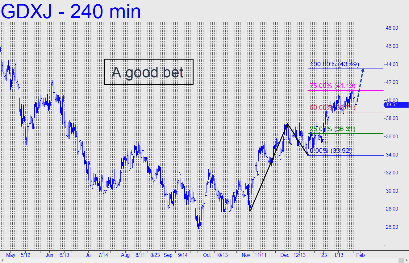 Having topped last week a penny below a longstanding Hidden Pivot target at 41.17, GDXJ presumably will need a little rest for the next upthrust. When this mining ETF takes flight, the 43.49 Hidden Pivot shown in the chart can serve as a minimum price objective. The pattern is less than ideal, since B is a ‘sausage’ peak that failed to surpass some external peaks well to the left. However, the subsequent dance so close to p= 38.71 has made up for the typical sausage drawbacks of unreliability and inaccuracy. Moreover, it’s hard to imagine GDXJ lacking the power to reach D no matter how illegitimate the pattern. A vicious swoon to x=36.31 would trigger a screaming ‘mechanical’ buy. In this case, however, given the relentless persistence of the trend, it can be attempted on a pullback to p=38.71 with a stop-loss at 37.11. Paper-trade this one if you still need persuading that the preponderance of ‘mechanical’ trades posted here and in the chat room are winners. _______ UPDATE (Feb 3, 11:37 a.m. EST): If this unusually vicious takedown continues, X=36.31 should be bought ‘mechanically’, stop 33.92. A ‘camo’ trigger should be used to reduce entry risk by perhaps 90%. This gambit is ‘textbook’, but paper-trade it if you are not yet comfortable with ‘mechanical’ set-ups.