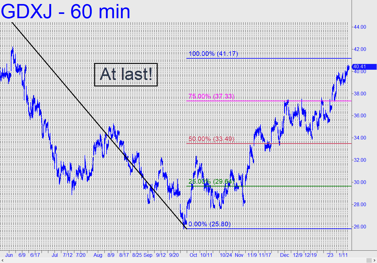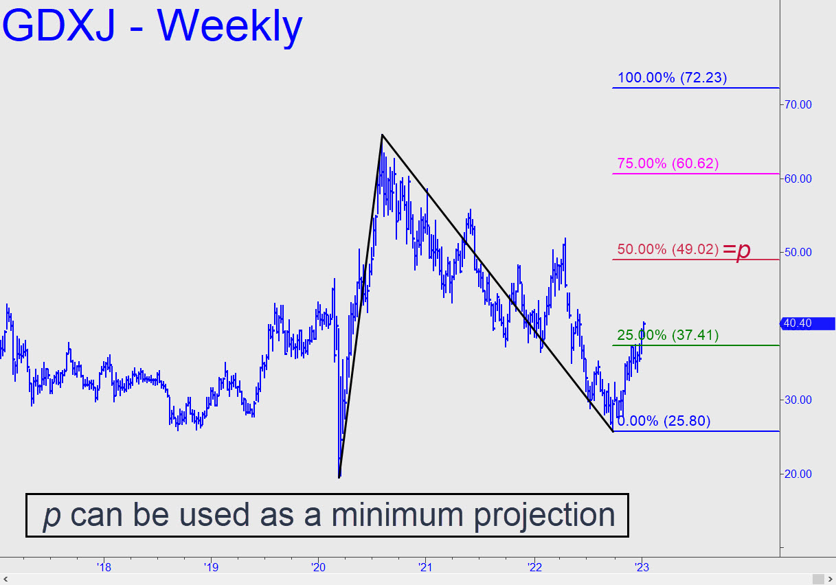 A 41.17 target first signaled more than four months ago with GDXJ trading under 30, looks all but certain to be reached this week. As slow as it was in coming, it was never in doubt after buyers gapped GDXJ past p=33.49 on Nov 9. Adding to the picture of strength was the absence of any pullbacks sufficient to trigger a ‘mechanical’ entry of daily-chart degree. Now we can expect a further ascent to at least p=49.02, a midpoint Hidden Pivot correlated with a ‘D’ target at 72.73 (!). As always an easy move through any of the levels in this pattern can be taken as a sign that the uptrend will continue. We’ll look for low-risk boarding spots along the way for subscribers seeking either to augment long positions or initiate new ones.