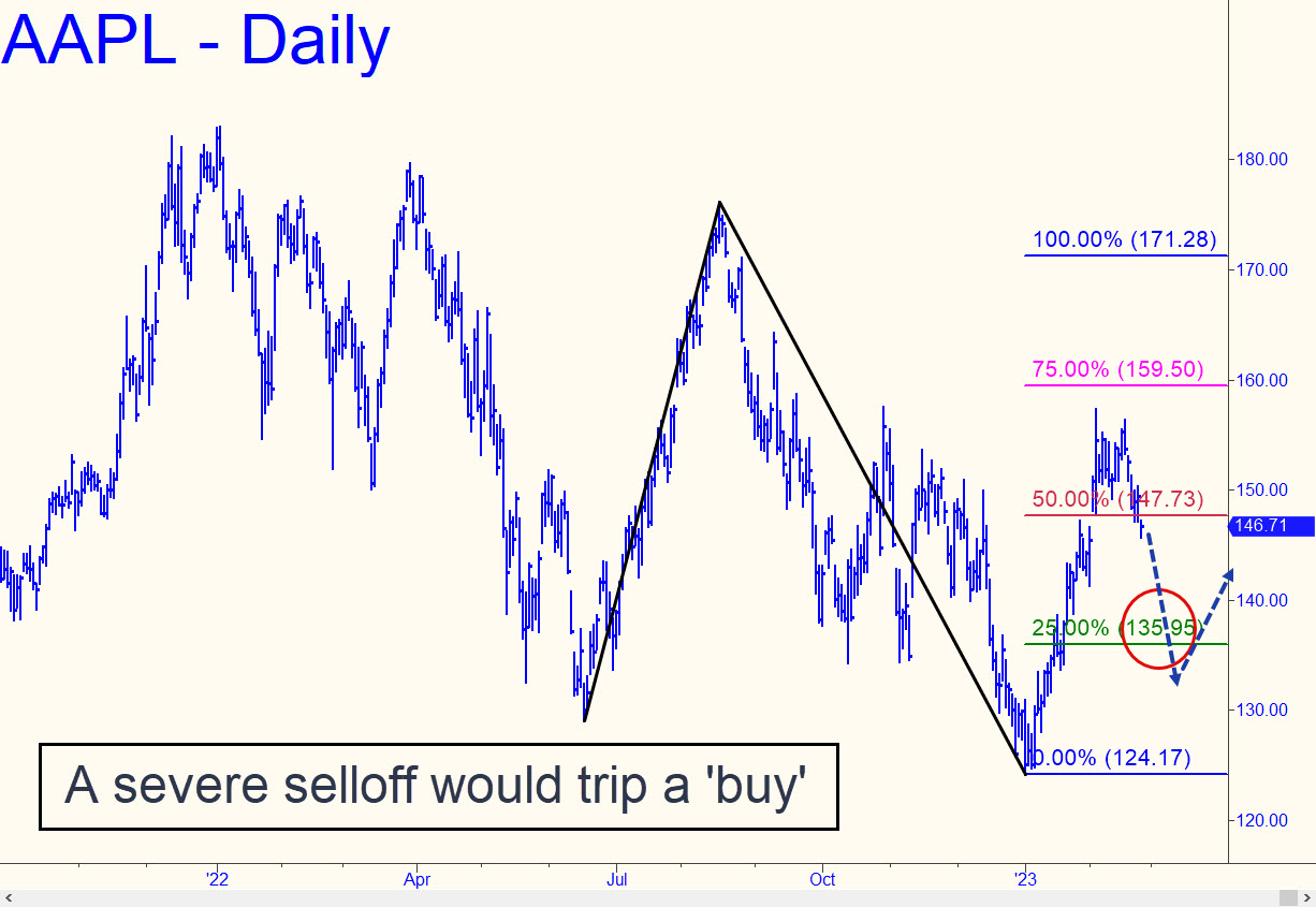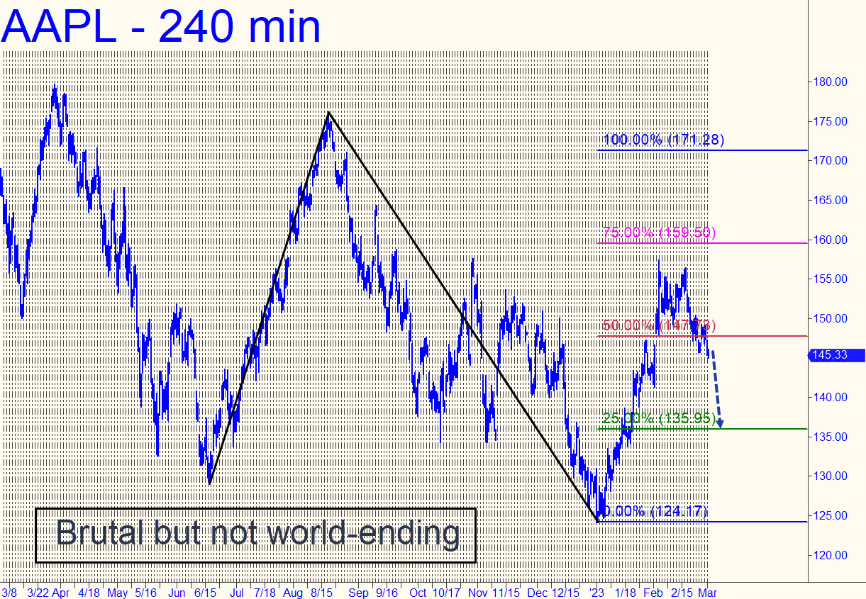 Our infallible stock-market bellwether remains mired in a bear market that could have years to run, but that doesn’t necessarily mean a a collapse below $100 is imminent. A less serious fall to 135.95 would trigger a fetching ‘mechanical’ buy, actually, with a potential ride up to as high as D=171.28. We’d likely take the money and run with AAPL trading well shy of that, since bear-market rallies are not supposed to reach their d targets. If there is anything in the chart that might give bears a ray of hope, it is the narrow failure of the short-squeeze begun from 124 to exceed October’s ‘external’ peak at 157. AAPL’s institutional sponsors may be thieves, deceivers, cheats and bullies, but it turns out they are also too lacking in guts and conviction to fool this chart into turning very bullish. ______ UPDATE (Mar 1, 9:51 p.m.) The 135.95 ‘mechanical’-trade level mentioned above is looking increasingly likely to see action. Although that would imply a brutal plunge lies ahead, bear in mind that when the stock gets there and it seems like the end of the world, it will actually be an attractive BUYING opportunity.