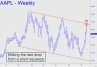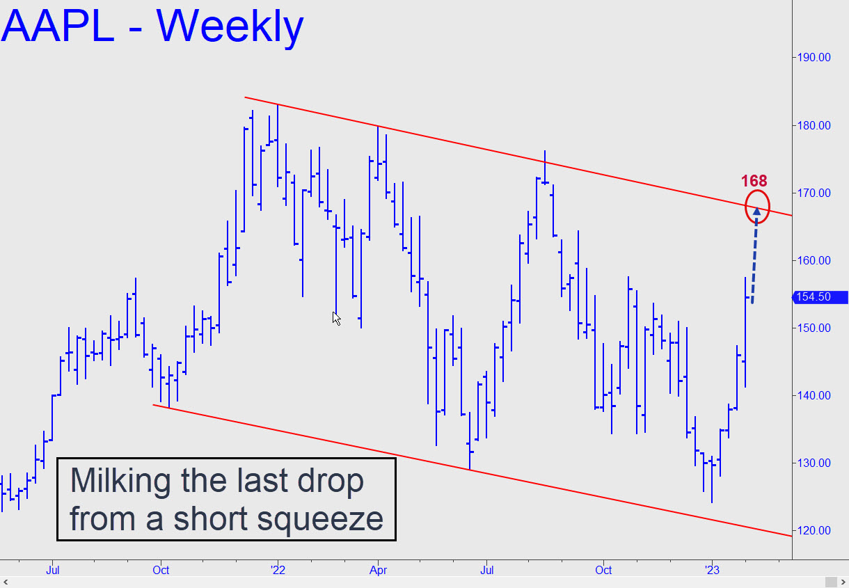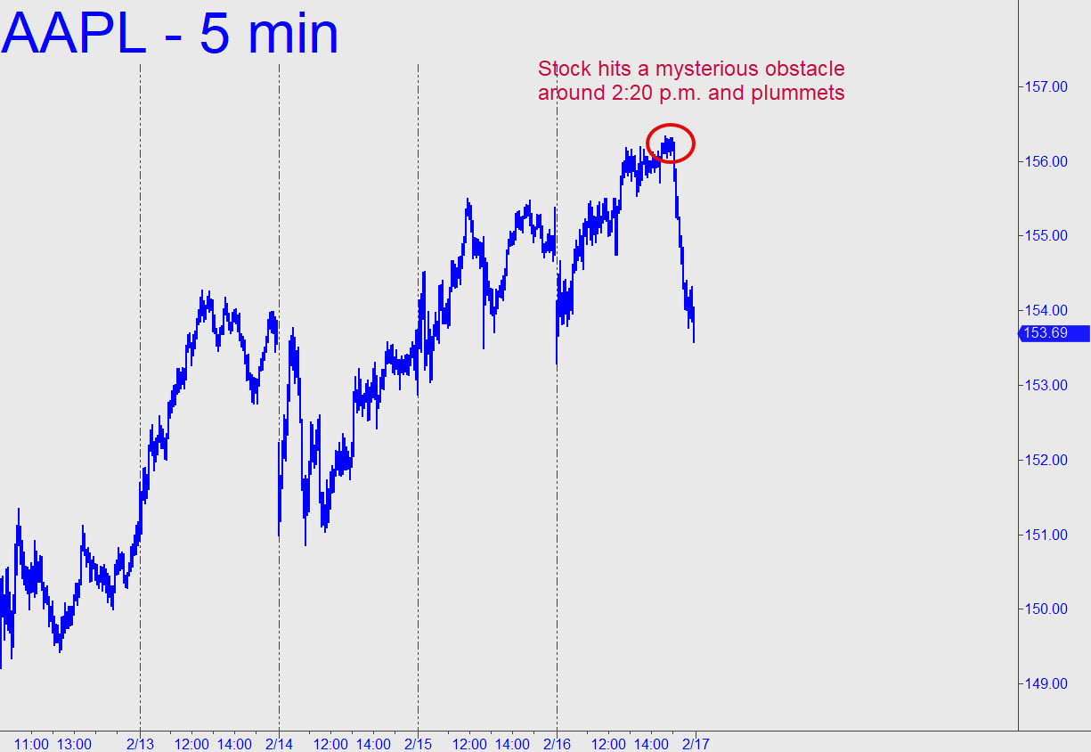 AAPL appears hellbent on reaching the top of a channel that has contained its huge ups and downs for more than a year. If the stock gets there within the next two weeks, the line’s presumptive stopping power would be felt at around 168. It’s reasonable to ask whether the rally is capable of reaching the line, but any progress above it would seem as unlikely as the emergence of a booming global economy from a debt contraction that has only recently begun. We shouldn’t assume that this is impossible, but neither should we pass up the several opportunities to get short nearly risklessly that would occur as the stock ascends toward the channel line. _____ UPDATE (Feb 15, 8:30 p.m.): Here’s a speculation for Thursday if you’ve got money burning a hole in your pocket: Buy two expiring AAPL 155 puts if the stock touches 156.30 before 11:00 a.m. ET. I estimate they’ll be trading for around 0.73. Stop yourself out if AAPL exceeds 157.38. ______ UPDATE (Feb 16, 8:51 p.m.): The stock touched 156.33 and then crashed, sending Feb 155 puts that could have been bought for as little as 0.53 to 1.90 in less than two hours. All of this happened after 2:20 p.m., when, as I’d anticipated, I was too busy to provide timely guidance. That’s why I suggested an 11:00 a.m. cutoff for the trade. Fortunately, some subscribers who ignored the clock and acted on my recommendation (see above) above were rewarded with windfall profits by day’s end. Here’s a graph of AAPL’s delightful plunge — doubtless a surprise to everyone but us.