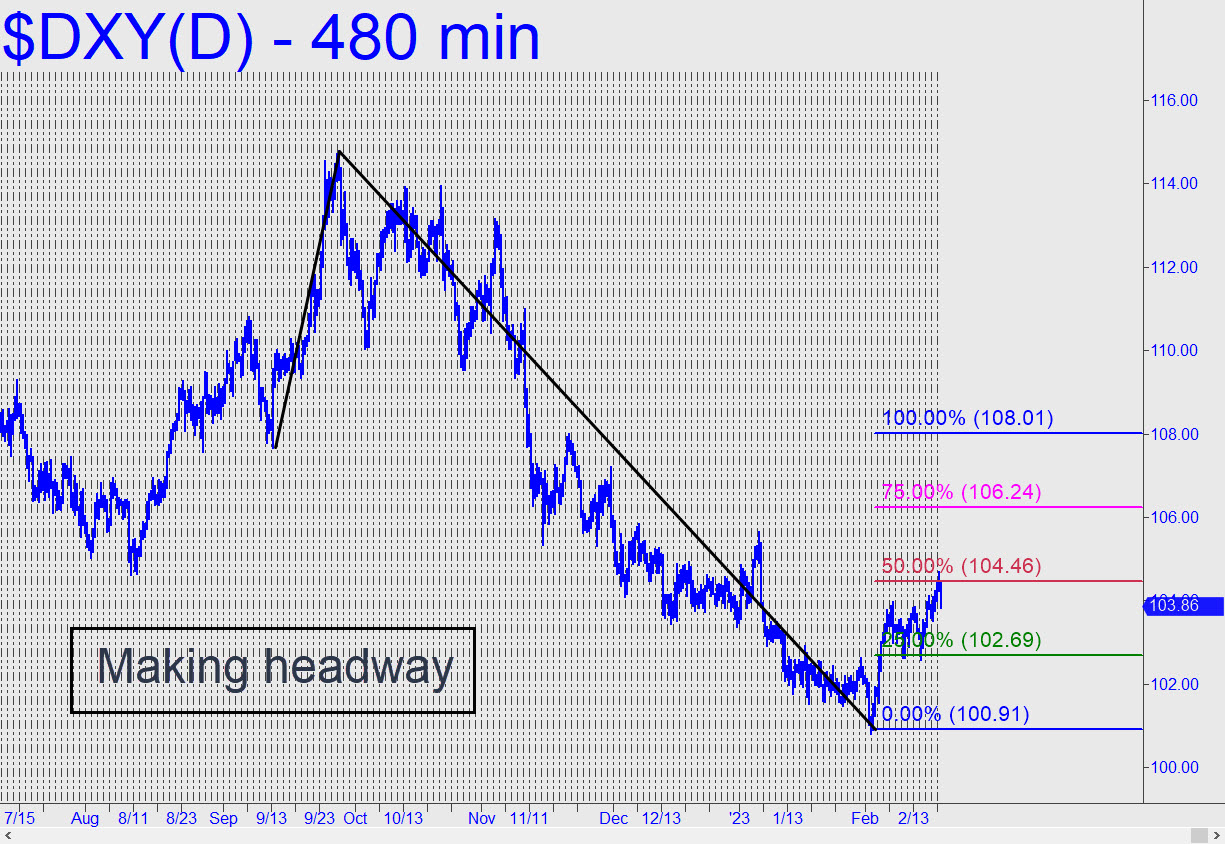 The Dollar Index made modest progress last week toward a 108.01 rally target we’ve been using as an upside objective for the intermediate term. It should take 5-7 weeks to reach this number, assuming it is achieved at all. That is by no means assured, however. Until such time as DXY pushes decisively past the p=104.46 midpoint Hidden Pivot where it stalled last week, I cannot offer you a high-confidence forecast. More immediately, bulls will need to breach the 105.31 ‘external’ peak recorded on January 6 to demonstrate their staying power. _______ UPDATE (Feb 25): The Dollar Index exceeded the 105.31 peak noted above by a penny on Friday. That’s as significant technically as $2 overshoot, and it implies DXY will continue toward the 108.01 target. Gold will of course remain under pressure.