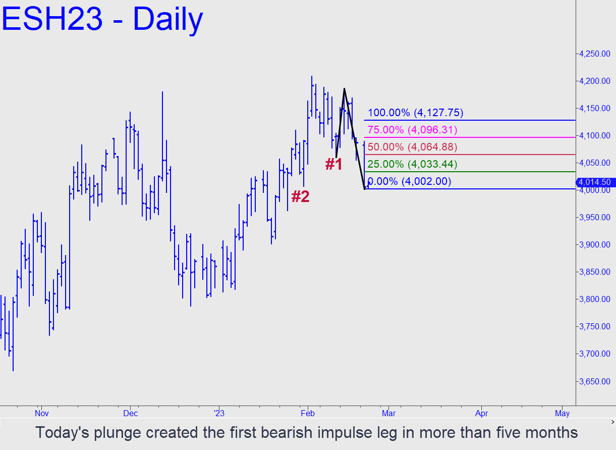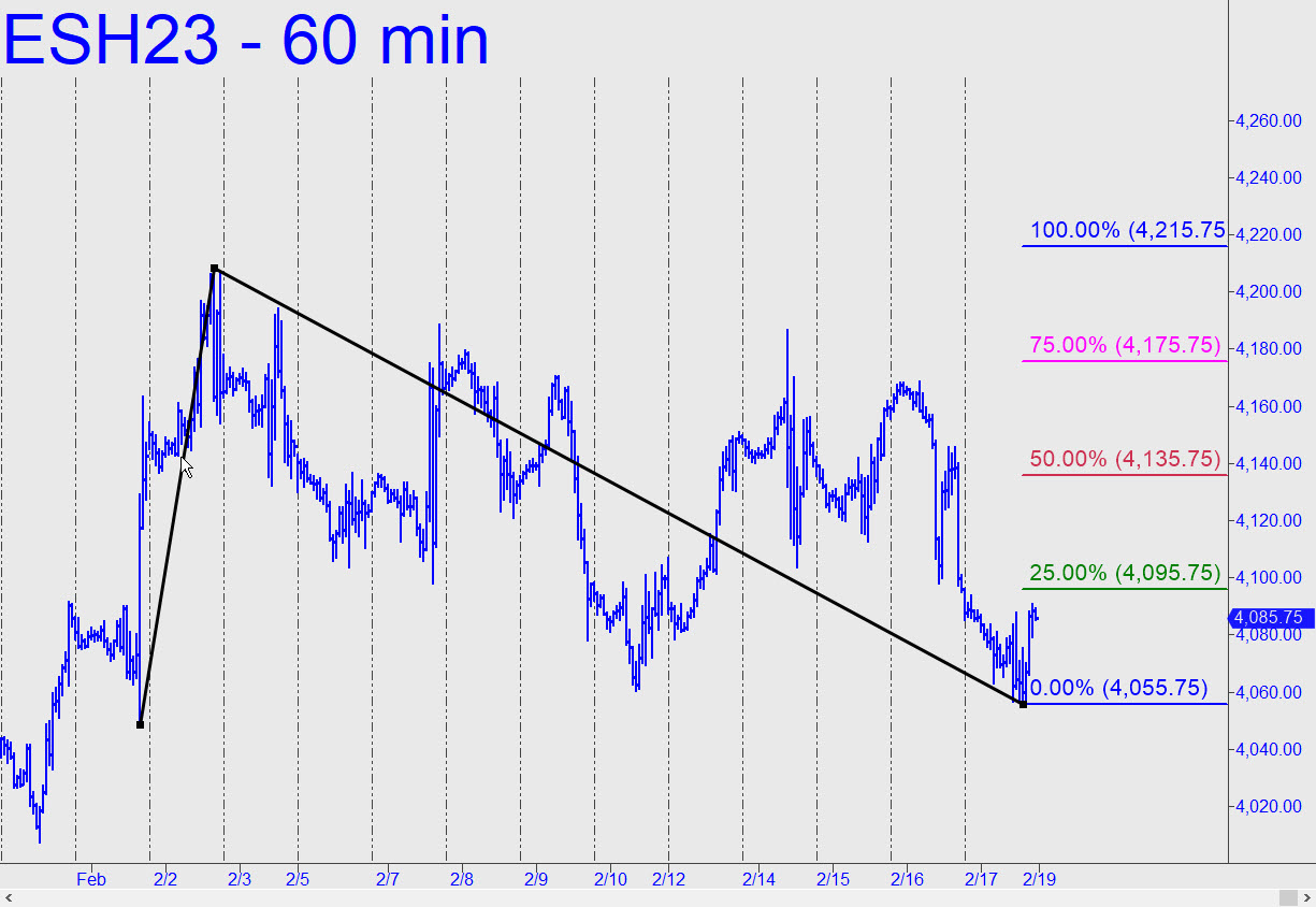 Let’s start the week with modest expectations, since the March contract spent the last three weeks screwing the pooch. That’s not bad, actually, considering the cascade of dispiriting earnings announcements over that period. The pattern shown projects a run-up of as much as 130 points over the near term to a 4215.75 target, assuming the futures are ready to ditch the doldrums. The ABCD is a little too obvious to deliver swing highs and lows that are as reliable and precise as we’re used to, but it will probably support a favorable ‘mechanical’ buy if there’s a pullback to the green line from above p=4135.75. ______ UPDATE (Feb 22, 12:16 p.m.): Today’s plunge following a three-day weekend generated the first bearish impulse leg we’ve seen on the daily chart in more than five months. I have drawn a bullish ‘reverse’ pattern nevertheless because the intraday low occurred precisely at the ‘D’ target of a presumptive abcd correction. The recovering bounce has been feeble so far, and that’s a point in bears’ favor at the moment. However, that could change overnight, and if the futures do in fact continue their bounce, nearly any reverse pattern you could draw to trigger a bull trade would be a good bet to return a profit. Alternatively, if the March contract relapses and closes for two consecutive days beneath the 4002.00 intraday low, a fall to at least p=3796.00 would become no worse than an even bet. A slight overshoot of that midpoint Hidden Pivot support could generate a quite powerful impulse leg if there are no significant upward retracements en route, lending weight to speculation that papa bear has returned with a vengeance.