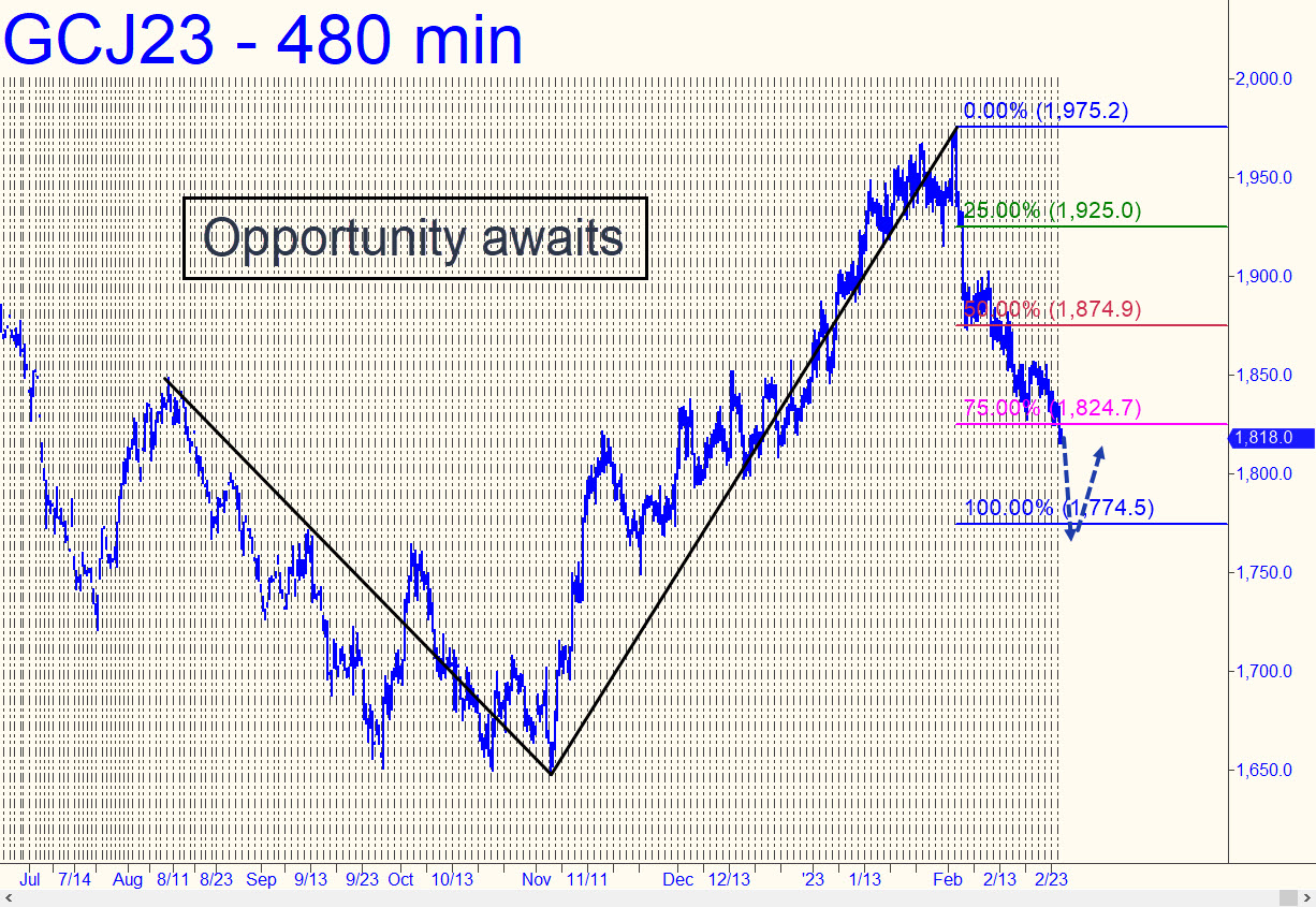 The futures made progress last week toward the 1774.50 Hidden Pivot target that has served as our minimum downside projection for a while. The presumptive correction began nearly a month ago from 1975. It has been brutal, but the predicted low beckons as an opportune place to attempt bottom-fishing. As always, a camouflage trade trigger will be the preferred method to get onboard, since it can enable us to lose nothing or even make a few bucks even if we are wrong about where a bottom might form.