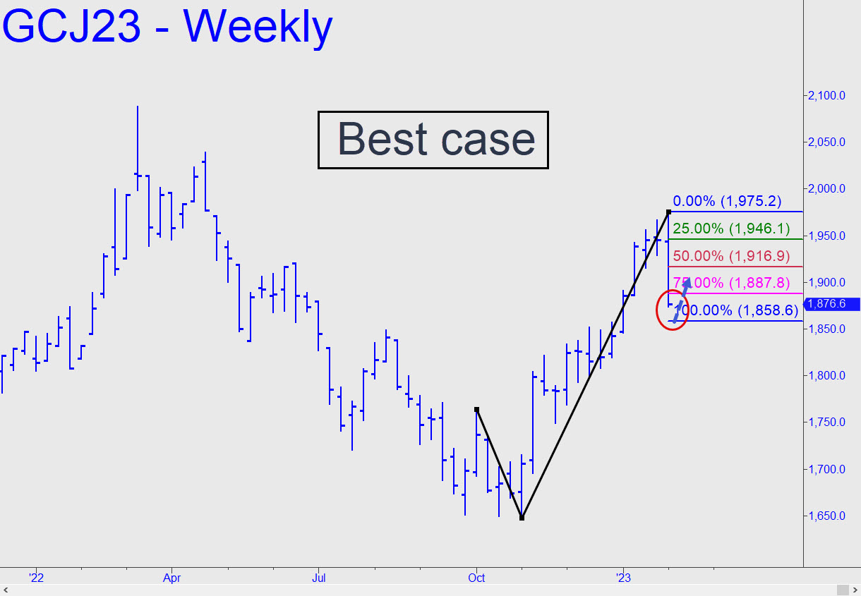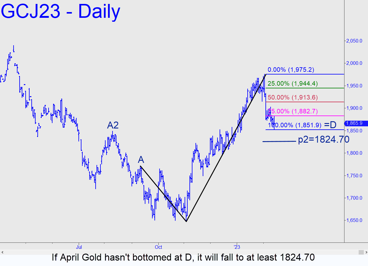 The 1858.60 downside target of the reverse pattern shown is probably the best we can hope for, given the way bullion’s personal Darth Vader crushed gold on Friday for no great reason. (Okay, it was getting a tad overbought, all right?) You can bottom-fish there with a tightly stopped ‘camo’ trigger crafted from the 5-minute chart, but if the trade gets stopped out be ready for more slippage to at least 1824.70 or even 1774.50 if any lower. Those Hidden Pivot supports are derived from a larger reverse pattern using A=1848.40 on 8/12. _______ UPDATE (Feb 14, 4:03 p.m.): Although I still expect the April contract to continue falling to at least p2=1824.70, or possibly to 1774.50 (see above), today’s bounce from the D target of a smaller pattern raises the possibility that a bottom is in. Here’s the chart. _______ UPDATE (Feb 17, 8:55 a.m. ET): The overnight low came within $3 of the touted minimum downside target of 1824.70 — close enough be considered fulfilled. A further drop to my worst-case number, 1774.50, is NOT a foregone conclusion, as the tout implies, although it would be if the futures relapse and crush p2=1824.70. However, a relapse could conceivably do no worse than bring the April contract down to a low that would more precisely fulfill the forecast. For my own trading purposes, the $3 gap is sufficient to negate rABC bottom-fishing, at least for the moment.