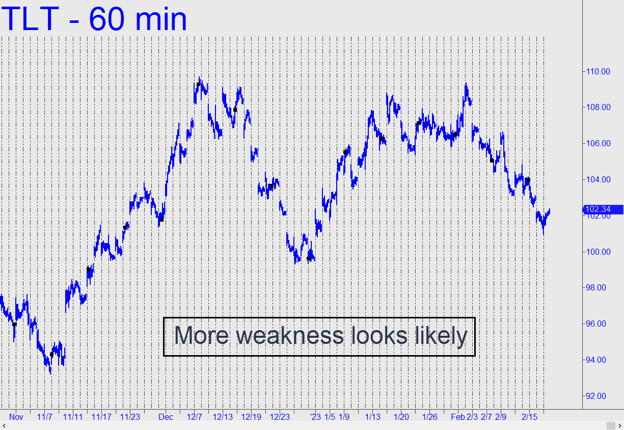 Although TLT’s downtrend reversed last week from very near the 101.33 Hidden Pivot where we’d expected it, I doubt that this will mark sellers’ final gasp. It would take a rally exceeding the 104.83 ‘external’ peak recorded on Valentine’s Day to bring some bullish energy to the chart. However, my hunch is that a test of structural support around 99.40, where a double bottom was carved out in the final days of 2022, is more likely.