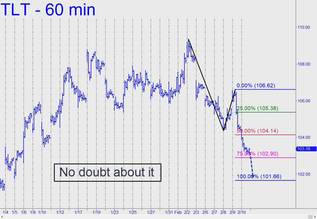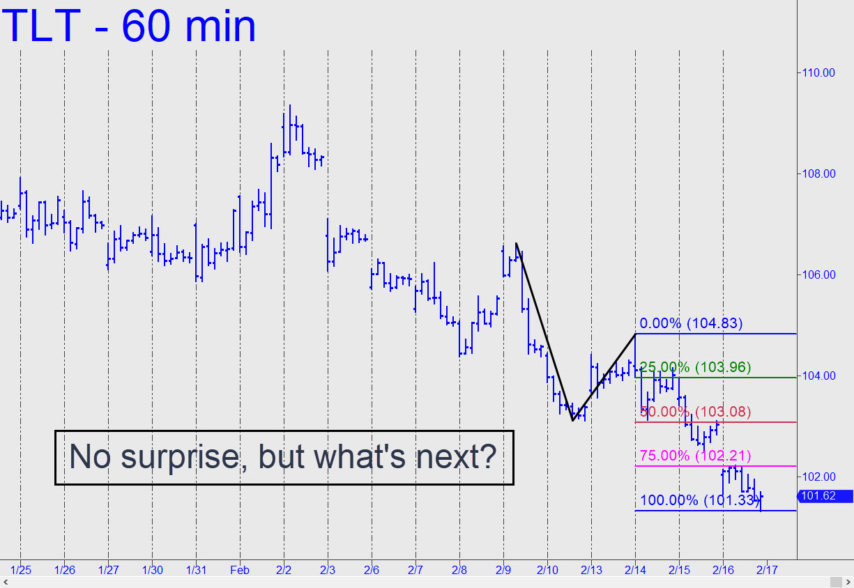 TLT took a $2.20 bounce from with six cents of the 104.45 target flagged here for bottom-fishing, but the rally was short-lived. The relapse has further to go and looks likely to achieve the 101.66 downside ‘D’ target shown in the chart (inset). A pause at p2=102.90 could occur, but the way sellers crushed the 104.14 midpoint support, the respite is unlikely to be tradeable. Bottom-fishing precisely at 101.66 doesn’t look promising either, since the herd will be nervously focused on the nearby low at 101.78 recorded on Jan 5. ______ UPDATE (Feb 16, 8:26 p.m.): A minor Hidden Pivot support at 101.33 has precisely contained the latest plunge of this sack of lug nuts, but it remains to be seen whether it has terminated it.