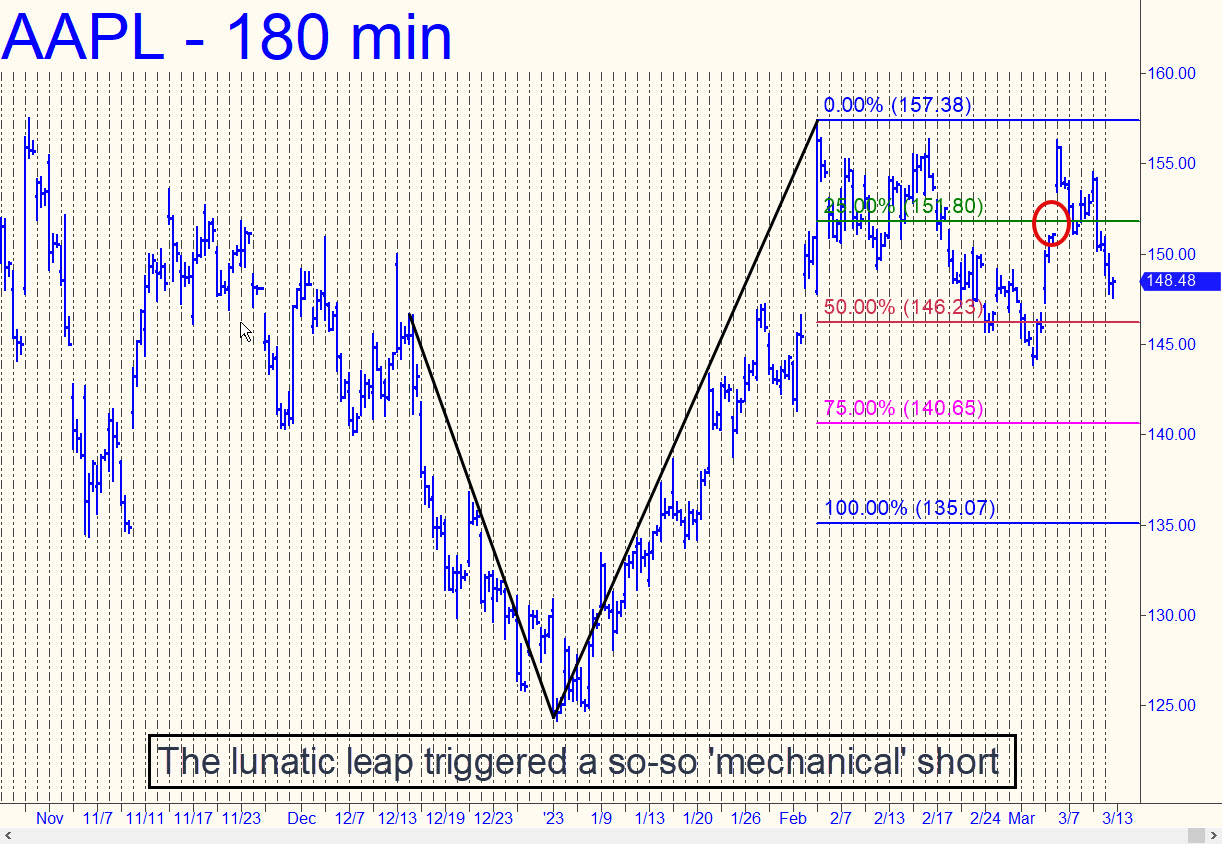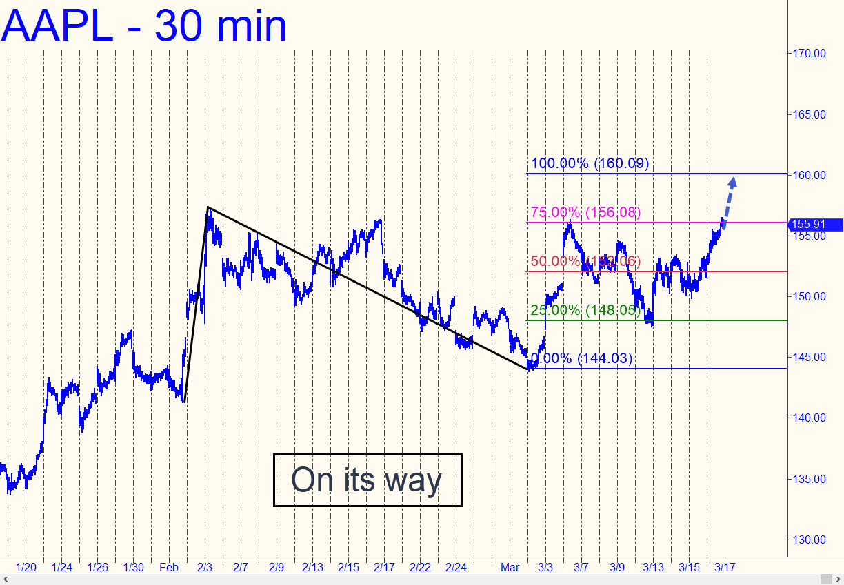 I could just as easily have supplied a big, bearish pattern peak to begin the week, but I settled on a more modest discouragement, since AAPL seems reluctant to fall apart. Still, rallies have been routinely failing to exceed prior peaks, and that’s reason enough to favor the bearish (i.e., corrective) case for now. The graph shows the stock to have triggered a ‘mechanical’ short last Monday with a heavily engineered lunatic leap that would have added nearly $100 billion to the U.S. economy in mere minutes. The subsequent relapse ‘should’ be able to hit p=146.23, but it’s not predictable at the moment whether further weakness will be sufficient to crush it. If AAPL’s canny sponsors seize the upper hand and run the stock up the old wazoo, look for yet another fraudulent but potent rally to 159.96 (180-min, A=.141.32 on 2/1). Otherwise, the 135.07 target shown will remain viable as a downside objective. _______ UPDATE (Mar 13, 9:03 a.m.): The smash low of AAPL’s $4.70 reversal from an overnight peak has bounced from within a nickel of the 146.23 Hidden Pivot noted above. [This occurred an hour before the regular session opened.] The stock has been there before, setting up a ‘mechanical’ short at the green line that would have required taking a partial profit (at p) this morning. Let’s see if the low holds. If not, p2=140.65 would be in play as a minimum downside objective. ______ UPDATE (Mar 16, 11:23 p.m.): The stock appear bound for 160.09, the Hidden Pivot ‘D’ target shown in this chart.
