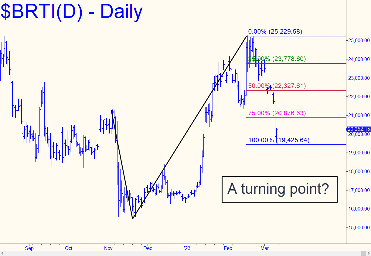 Friday’s robust upturn came from within 156 points, or less than 1%, of the 19425 correction target shown (see inset). That put it slightly out of range for bottom-fishing, at least via our usual methods, but the 700-point rebound that ensued suggests the uptrend has the potential to get legs. The smart money trapped in bitcoin at much higher prices will not be able to push the recovery too aggressively, however, since it is not short covering that drives rallies in bitcoin these days, but rather the absence of selling pressure, particularly when the stock market is on a bullish tear. I won’t update this tout unless something significant happens, but I will respond diligently to any queries in the chat room.