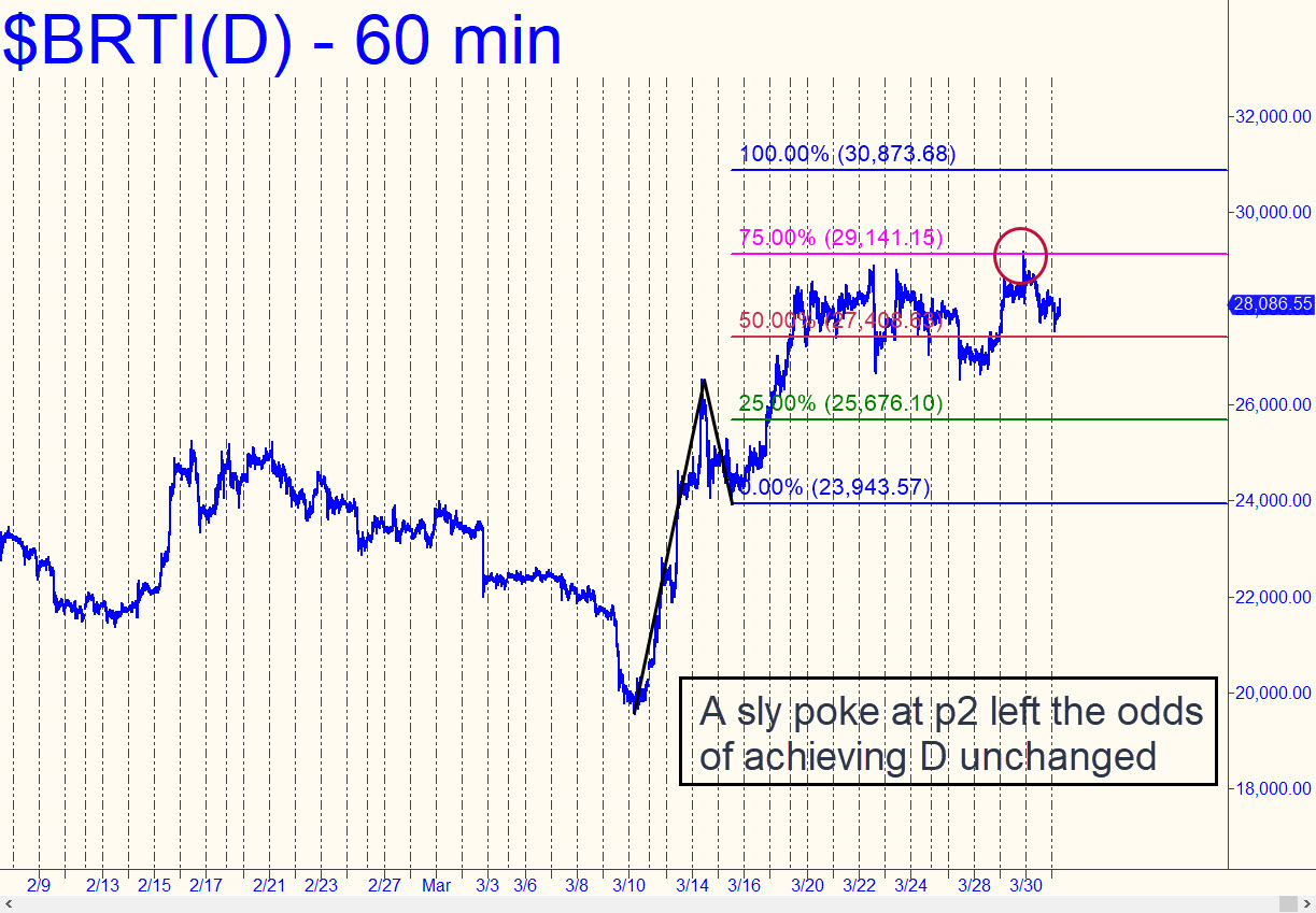 The impulsive phase of Bertie’s rally is quite steep, and I therefore doubt that C-D can replicate it. D=30,873 looks quite achievable nonetheless, and so you can use the pattern shown to get long ‘mechanically’ with a bid at x-25,676, stop 23,942. We don’t typically risk that much initiating trades, so I am suggesting this one only to traders who know how to cut the entry risk by 90% of more with a ‘camouflage’ trigger. Please note that BRTI is not a tradeable symbol, but rather a real-time reckoning of best bids and offers across a wide variety of cryptos. ______ UPDATE (Mar 31, 9:10 a.m.): Bertie took a gratuitous poke at p2=29,141 that did not alter the odds of a finishing stroke to D=30,873. Here’s the new chart.