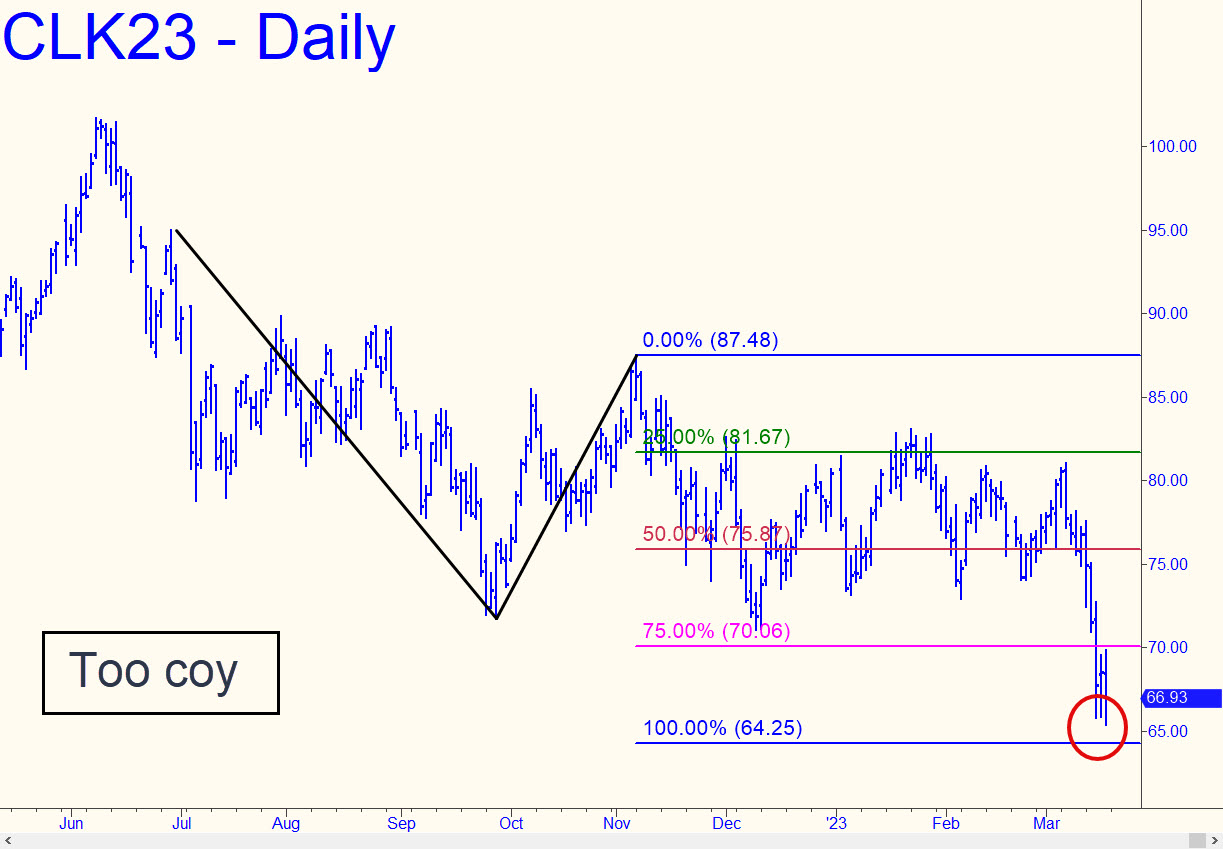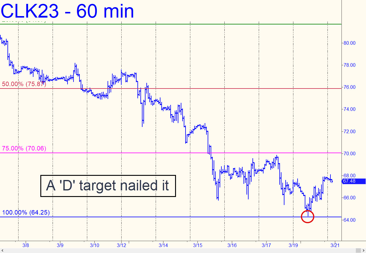 Just a little more selling would have brought May Crude down to a back-up-the-truck low at 64.25 where we would all have become bulls. Alas, the futures ran out the clock last week pussyfooting with lows just above this Hidden Pivot support, leaving a cloud of uncertainty hanging over the world’s most valuable commodity as the new week begins. There is obviously a lot of bottom-fishing going on, so we should expect some more stop-outs beneath prior lows before crude gets traction. Another possibility, less likely, would be a gap-up opening on Sunday that leaves bulls choking on dust. _______ UPDATE (Mar 20, 9:14 p.m.): The futures rallied nearly $4 from a 64.36 low that missed my target by 11 cents. This happened at 5:00 a.m., however, an inconvenient time for U.S.-based traders. Only one subscriber mentioned it, so I have not established a tracking position. Here’s the chart.