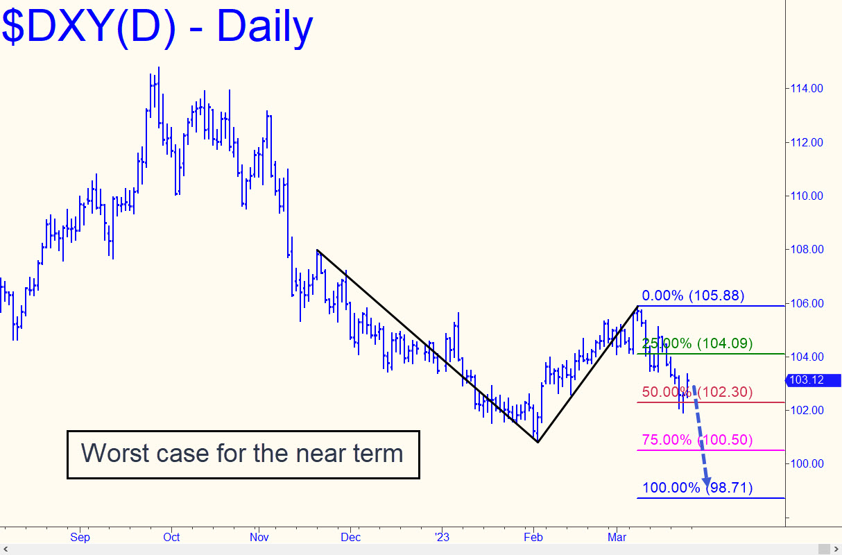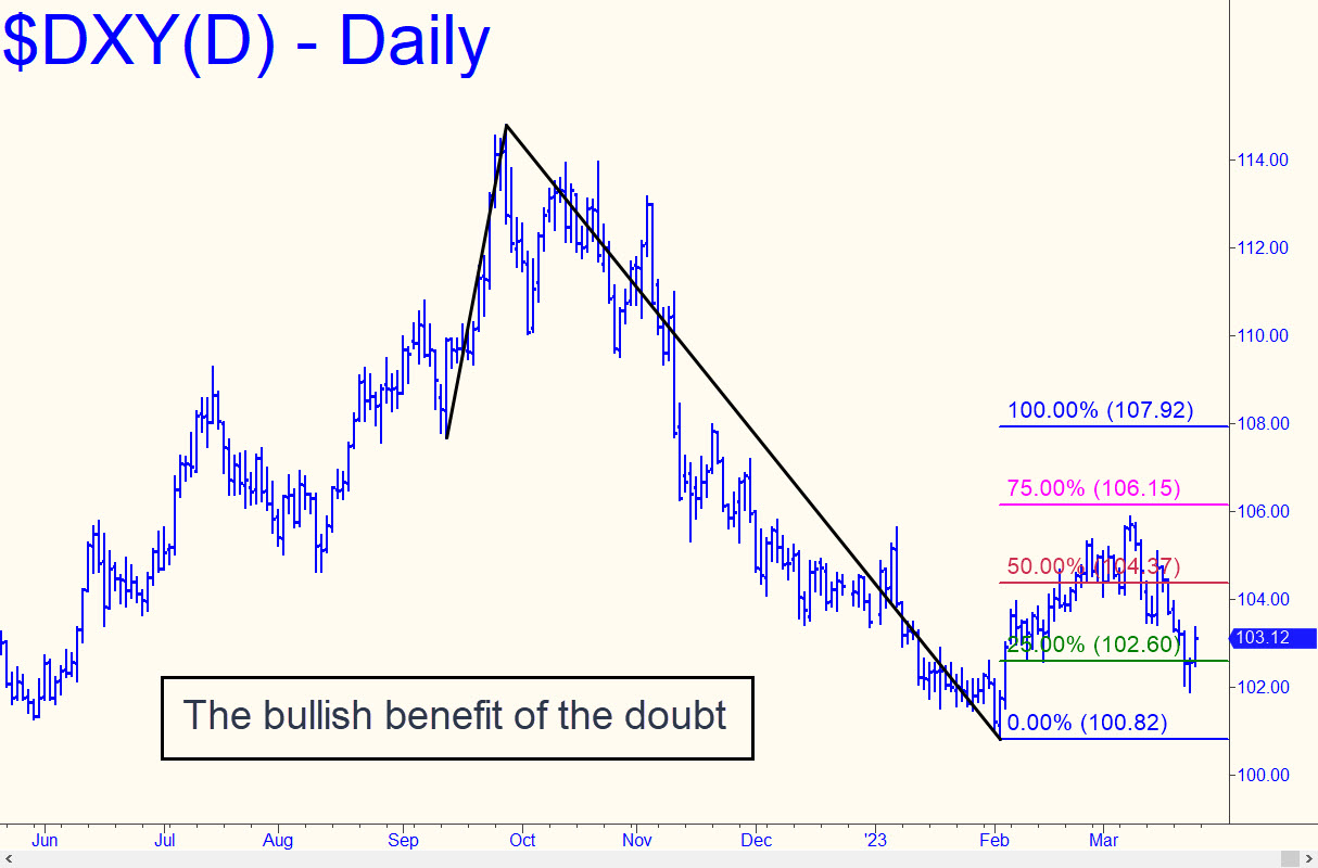 The dollar has looked like hell for the last three weeks, but I’ve given it the bullish benefit of the doubt nonetheless because DXY signaled an appealing ‘mechanical’ buy with last Wednesday’s fall to the green line (x=102.60). The implied rally target of the modest rABC pattern shown is 107.92, but that Hidden Pivot resistance would need to be slightly exceeded in order to take out a crucial external peak at 107.99 recorded last November. That would signal the likely return of the long-term bull market begun at the start of 2021 from 80.21. Alternatively, if the dollar continues to fall, it should be presumed bound for the 98.71 target shown here. This pattern also strongly implies that DXY should be ‘mechanically’ shorted at the green line (x=104.09). The bullish target at 107.92 would still be viable unless 100.82 were exceeded to the downside. (That’s the ‘c’ low of the pattern shown in the inset.)