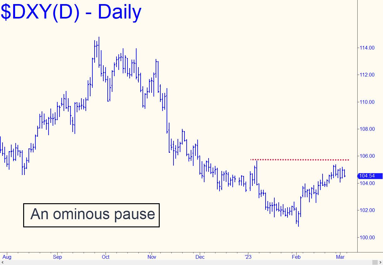 Last week’s five-day stall just shy of a crucial ‘external’ peak at 105.63 recorded on January 6 is not a healthy sign. I’ve labeled it ‘ominous’ in the chart, although we should probably give bulls the benefit of the doubt for at least another week while they regroup. Perhaps it will take a pullback and a running start to clear the structural hurdle? If so, the retracement had better not exceed the 102.59 low recorded on February 14, since that would turn the daily chart decisively bearish and shorten the odds of a fall to 100.55, a Hidden Pivot target that is already theoretically in play. _______ UPDATE (Mar 7, 5:08 p.m.): Har-har. Markets act so predictably like fun-house mirrors that we shouldn’t be even slightly surprised that today’s psychotic leap from lugubriousness exceeded my 105.63 benchmark by a whopping two cents. Tuppence is plenty enough for us to focus once again on the bullish case, since the rally created an undeniable, unmistakable impulse leg on the daily chart. Let’s see DXY can get past the next impediment, a voodoo number at 106.42.