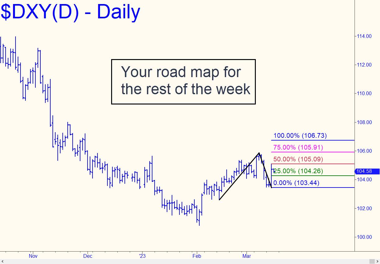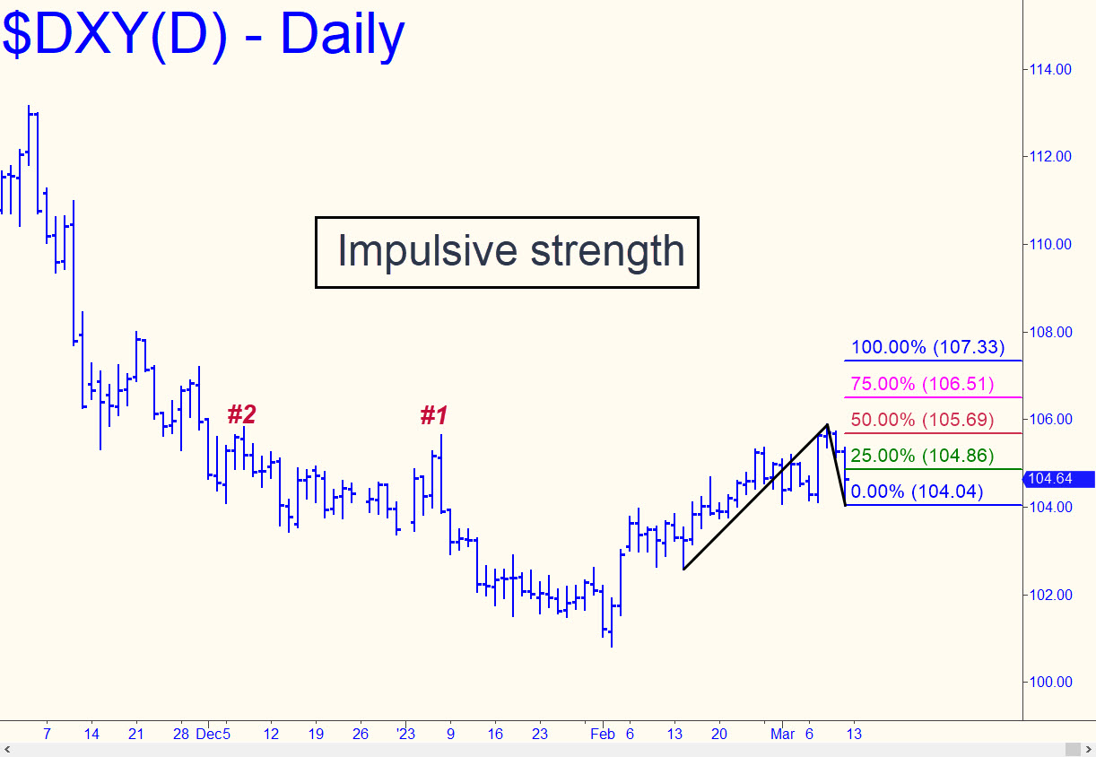 The dollar fell hard on Friday, wiping out gains achieved earlier in the week, but not before thrusting above two ‘external’ peaks recorded in, respectively, early December and early January. The impulse leg had sufficient power that even a relapse that takes out Friday’s low should still be viewed as corrective. The next big rally target would be into the 106-107 range or even higher, but first buyers would have to get past a ‘voodoo number’ at 106,42 mentioned here earlier. If this scenario plays out, then gold, which rebounded sharply as last week ended, would once again come under pressure. _______ UPDATE (Mar 15, 11:35 p.m.): It’s fascinating to see the dollar trading like a penny stock, leaping this morning from a low that lay just four pennies beneath a stop-out low from two days earlier. DXY appears headed for exactly 106.73, assuming it can overcome the very precise stall at p=105.09 of the pattern shown here. _______ UPDATE (Mar 20, 9:25 p.m.): The midpoint Hidden Pivot (p) at 105.09 stopped the rally dead in its tracks, sending DXY plummeting. Now, if p2=103.27 fails as support, expect the next leg down to hit 102.66 exactly, followed by a tradeable bounce. Here’s the chart. _______ UPDATE (Mar 22, 9:30 p.m.): The Dollar Index liquefied the clear and compelling Hidden Pivot support at 102.66 noted above, testifying to the urgency of the Fed’s campaign to destroy the dollar. Recent price action implies DXY will take out the spike low at 100.82 recorded on Feb 2. Here’s the chart.