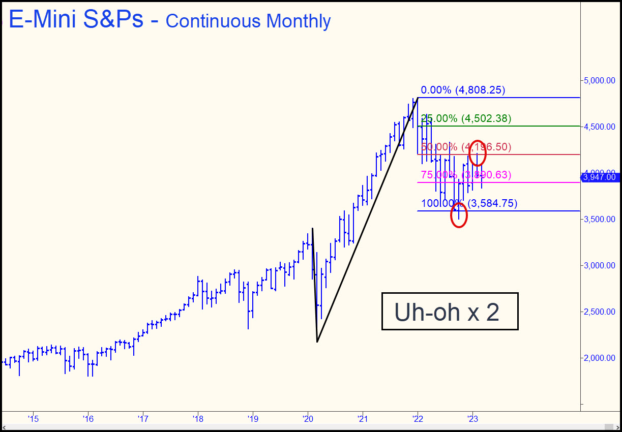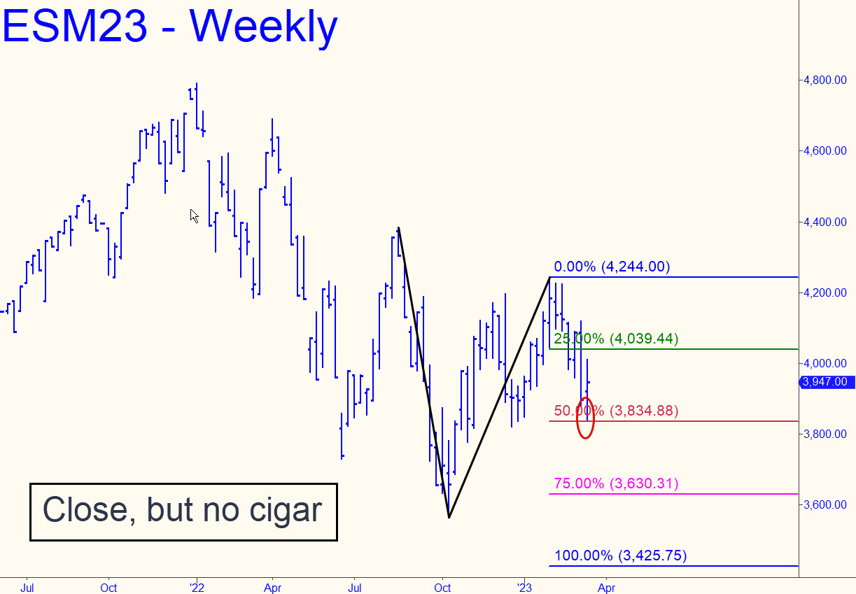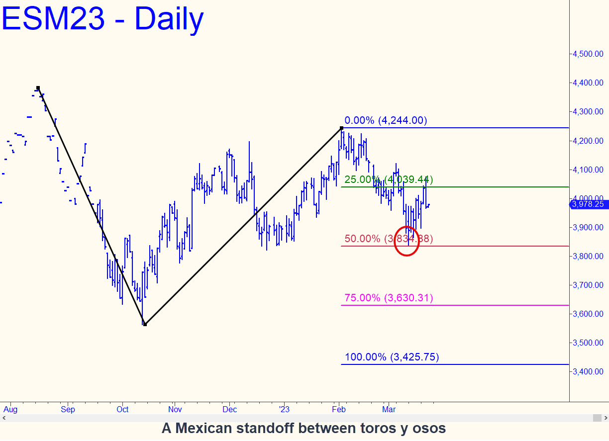 On a long-term chart, the exceptionally clean reverse pattern shown reveals some mildly disturbing signs that we hadn’t detected before. First there was the dip beneath the pattern’s D target at 3584.75. The 80-point overshoot amounts to 2.2%, and although that may not seem like much, for a pattern this crisp, any breach exceeding even 1% should be viewed as moderately bearish. The stall on the rebound at p=4196 is not quite as compelling because the Hidden Pivot levels were already spent. However, the bounce from D appears to have lacked guts because it died well shy of the ‘external’ peak just to the left. All of these factors together do not necessarily spell collapse, but they argue for trading the S&Ps with a bearish bias. Here’s a weekly chart of the June contract that projects to as low as 3425.75 if sellers take out p=3834.88 decisively. The futures were a spec buy when they nearly touched the red line, but because the low missed it by five points, a run-up to the green line would not trigger a ‘mechanical’ short under a strict interpretation of our rules. I’ve offered a bigger picture than usual because smaller ones show an impacted mess that is best traded on sub-hourly charts. _______ UPDATE (Mar 22, 9:00 p.m. EDT): This afternoon’s universally expected outbreak of mental illness produced no significant changes in the technical picture. A Mexican standoff began on Feb 13 when the futures reversed from p=3824 of this presumptive bear-market pattern. This was a logical place for a trend, even a major one, to end, but we will continue to bide our time trading the swings until a clearer signal comes. Bears may be feeling burned out by now, but that is no reason for them to think the bear rally begun in October is ready to swing their way. The news will remain irrelevant for as long as we can imagine, since all news is being treated as good news. This is a cyclical oddity beyond human understanding, and there is nothing anyone can do about it.