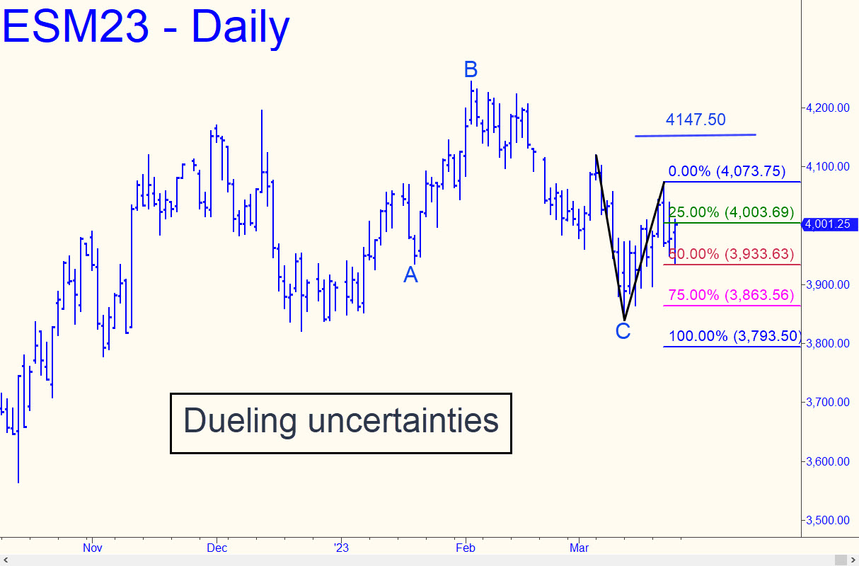 Both the uptrend and a smaller downtrend are shown in the chart, but with a bullish bias favoring an upthrust to D=4147.50 over the near term. This is justified by an impulsive spike midweek to 4073.75 that slightly exceeded a small ‘external’ peak recorded on March 9. The smaller abc downtrend could conceivably reach D=3793.50, but I doubt this will occur in the days ahead for the reason stated above, but also because the futures reversed almost precisely from the Hidden Pivot midpoint (p) at 3933.63. That is usually a sign that the dominant trend (i.e., up) is still controlling price action. If you trade this vehicle, your bias should be bullish for now, with a focus on ‘camo’ set-ups on the intraday charts that use price bars going back to around March 1. _______ UPDATE (Mar 29, 8:20 p.m. EDT): Buyers made solid headway toward the 4113.50 target that I posted in the chat room on Tuesday, but it’s not a done deal until the futures blow past p2=4069.38. Notice that the rally began at the green line with a perfect ‘mechanical’ buy signal.