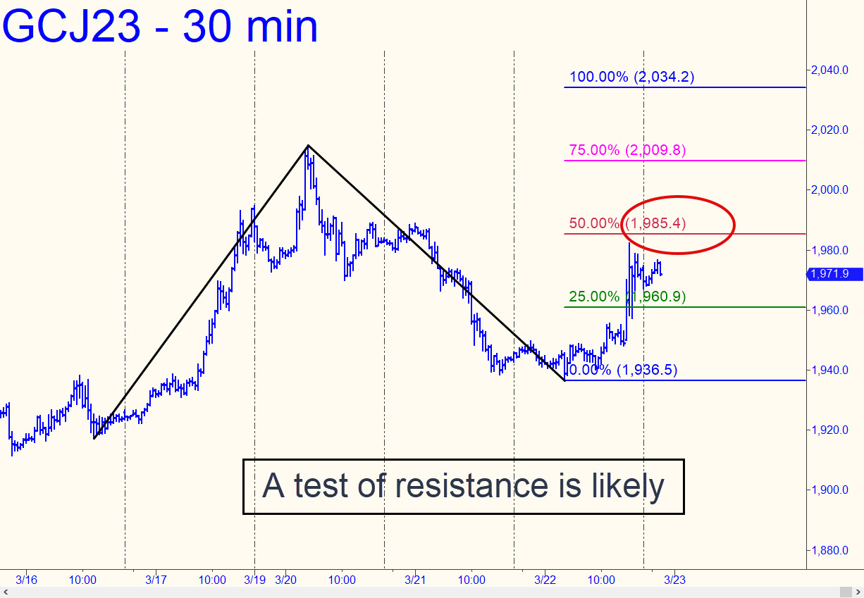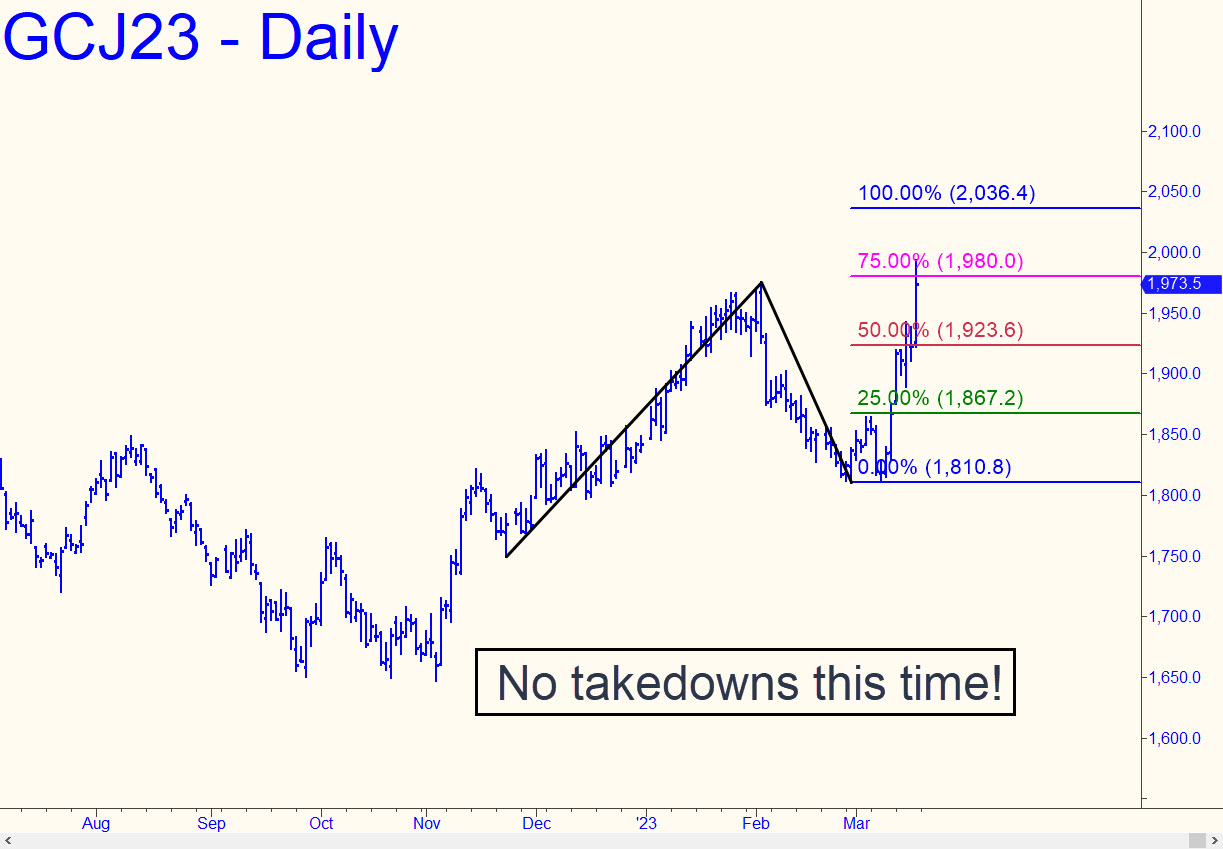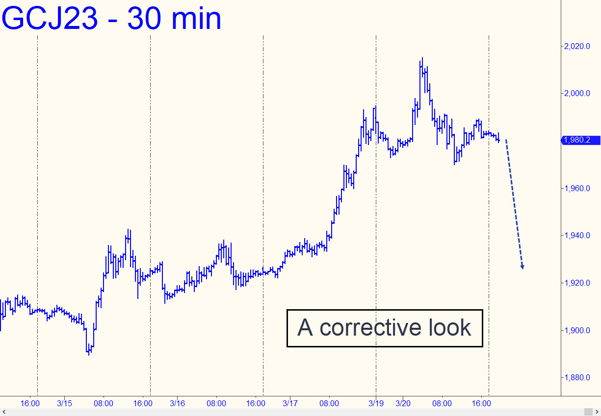 Buyers blew past the 1964.50 D target of a minor pattern with such ease on Friday that they all but clinched a further run-up to the 2036.40 target of the larger pattern shown (see inset). The psychologically important $2000 barrier is unlikely to provide much resistance as the new week begins, although it could act as support on a pullback. The move has been so steep that it has offered few opportunities to get aboard ‘mechanically, even on the lesser charts. Gold should start turning up in the headlines once it is trading comfortably above 2000, and that could be a problem for spinmeisters who would deign to suggest that all is right with the world. _______ UPDATE (Mar 20, 8:45 p.m.): Apparent distribution over the last two days has created a minor but potentially controlling head-and-shoulders pattern with the potential to send the futures down to 1930 or so in search of traction. _______ UPDATE (Mar 22, 9:11 p.m.): Today’s nutty, Fed-induced rally spilled into gold, driving the April contract into a parabola that negated the bearish head-and-shoulders pattern mentioned above. The new pattern project to 2034.20, with midpoint resistances, still untested. at 1985.40. Here’s the chart.