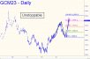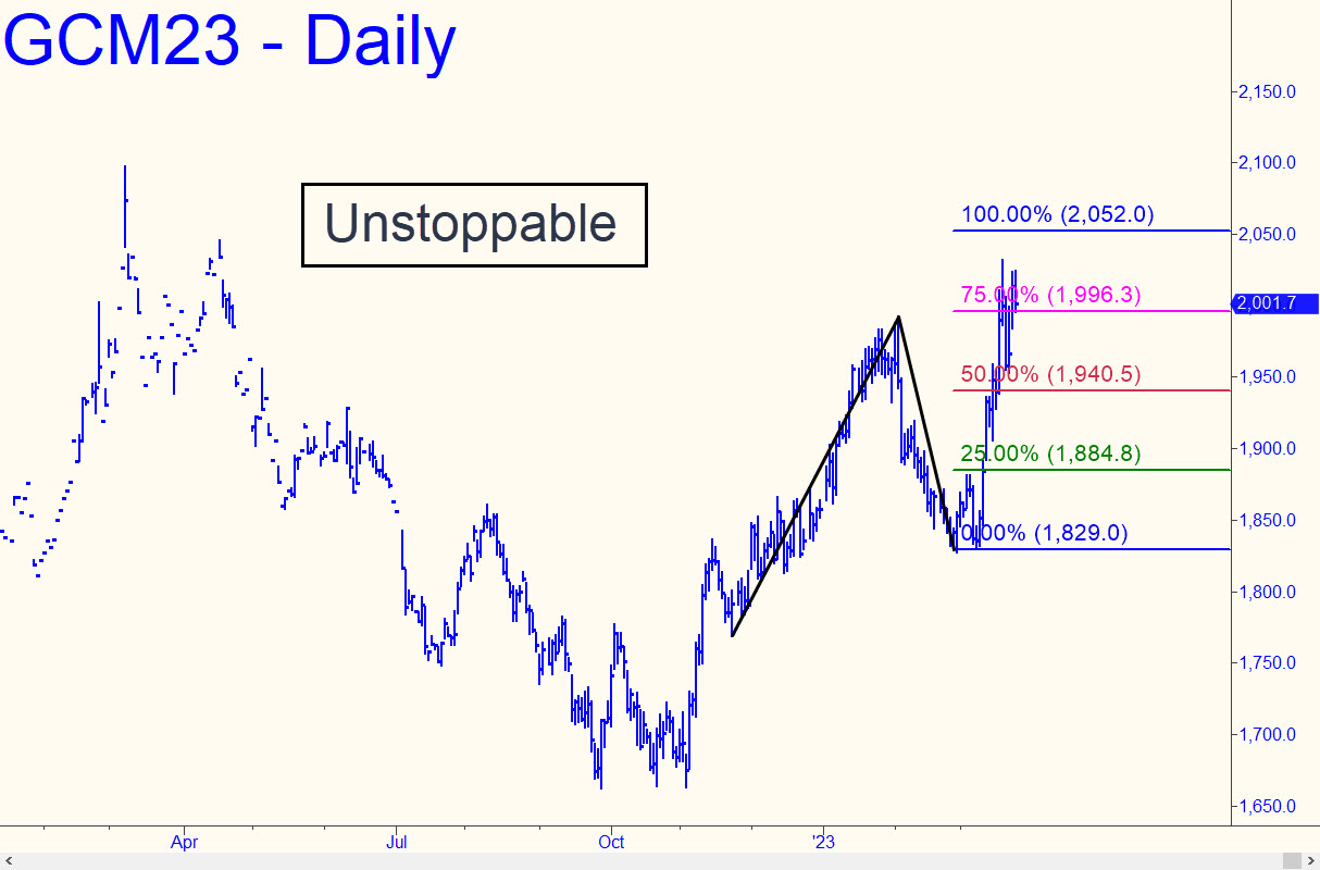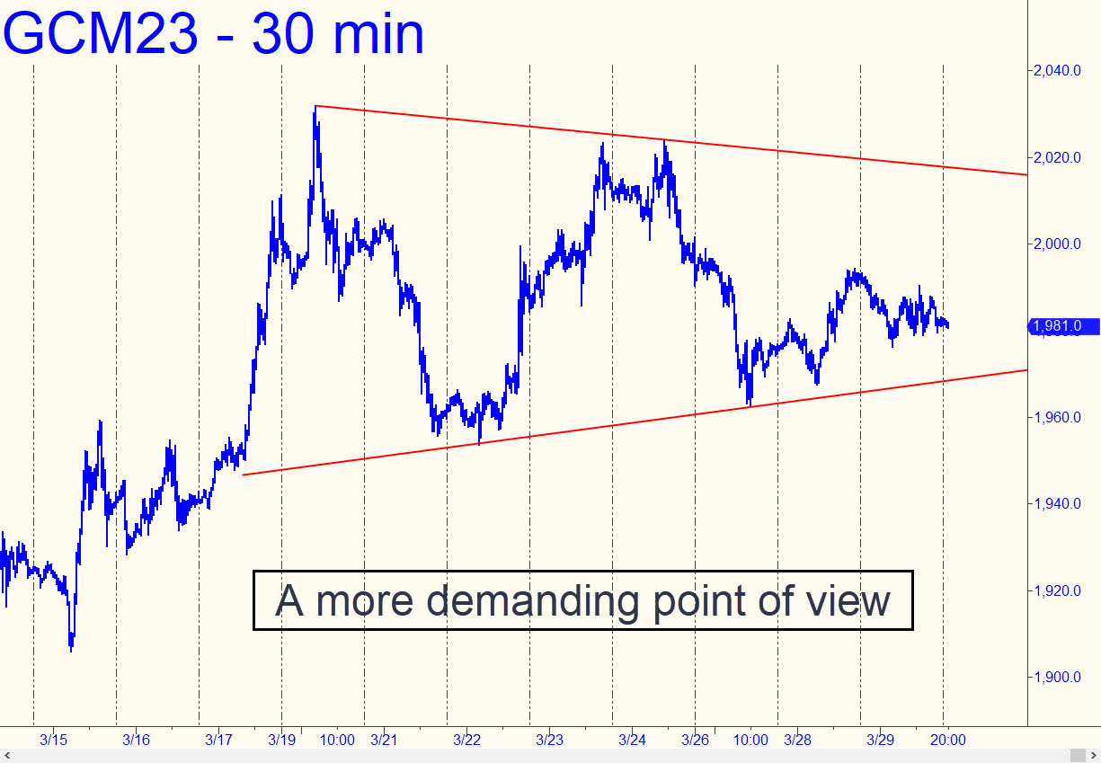 After shaking off a gratuitous midweek smackdown, June Gold was bounding on Friday toward the Hidden Pivot rally target at 2052.00 shown in the thumbnail chart. Buyers looked sufficiently revved up to achieve this objective easily within the next couple of days. If they do, and especially if they close above it for two consecutive days, you can confidently infer the futures are on their way to at least 2154.50, the next Hidden Pivot resistance of importance. It is derived from the pattern on the daily chart starting with A=1830.20 on March 8, and B=2031.70 on March 20. _______ UPDATE (Mar 29, 7:56 p.m. EDT): Here’s a more challenging view of gold — a pennant formation that visually raises doubts about 2052.00 being a lock-up. If the June contract cracks the lower trendline, I’d brace for more disappointment.