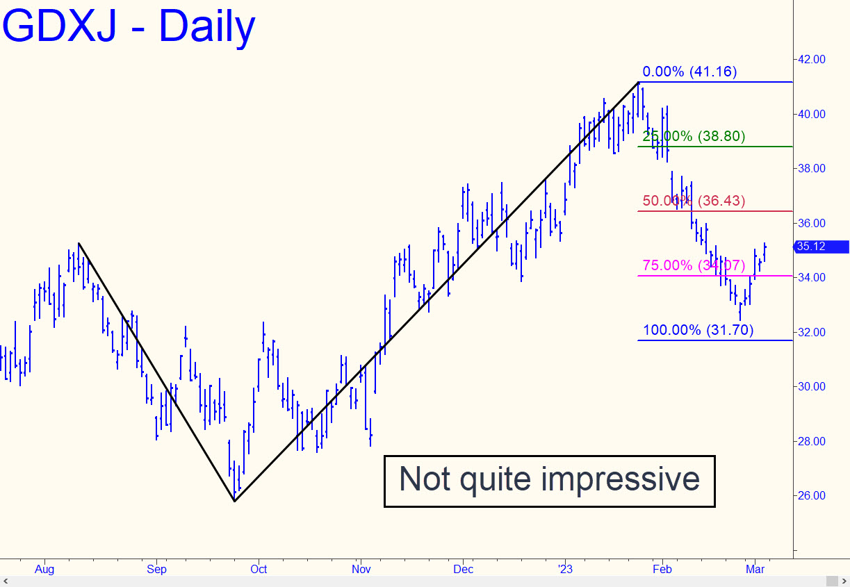 Since GDXJ’s rally met all the conditions I’d imposed on it last week, it’s time to throw more cold water on the bullish idea. The bearish case rests on the question of whether downside D=31.70, narrowly missed on the last bout of weakness, will ultimately be achieved. Regardless, a quick run-up now to x=38.80 would offer an excellent opportunity to get short ‘mechanically’. The implied relapse shouldn’t necessarily be expected to fulfill the downside D, however, and I doubt that it will. I remain skeptical in any event that the bounce that began from Feb 24’s bottom at 32.46 will get legs. I’d feel somewhat different about this if the third of my three conditions, a push above an ‘external’ peak at 35.15, had not required a one-day pullback and a running start. That is timid price action, and it suggests bulls don’t yet have the moxie to blitz doubters.