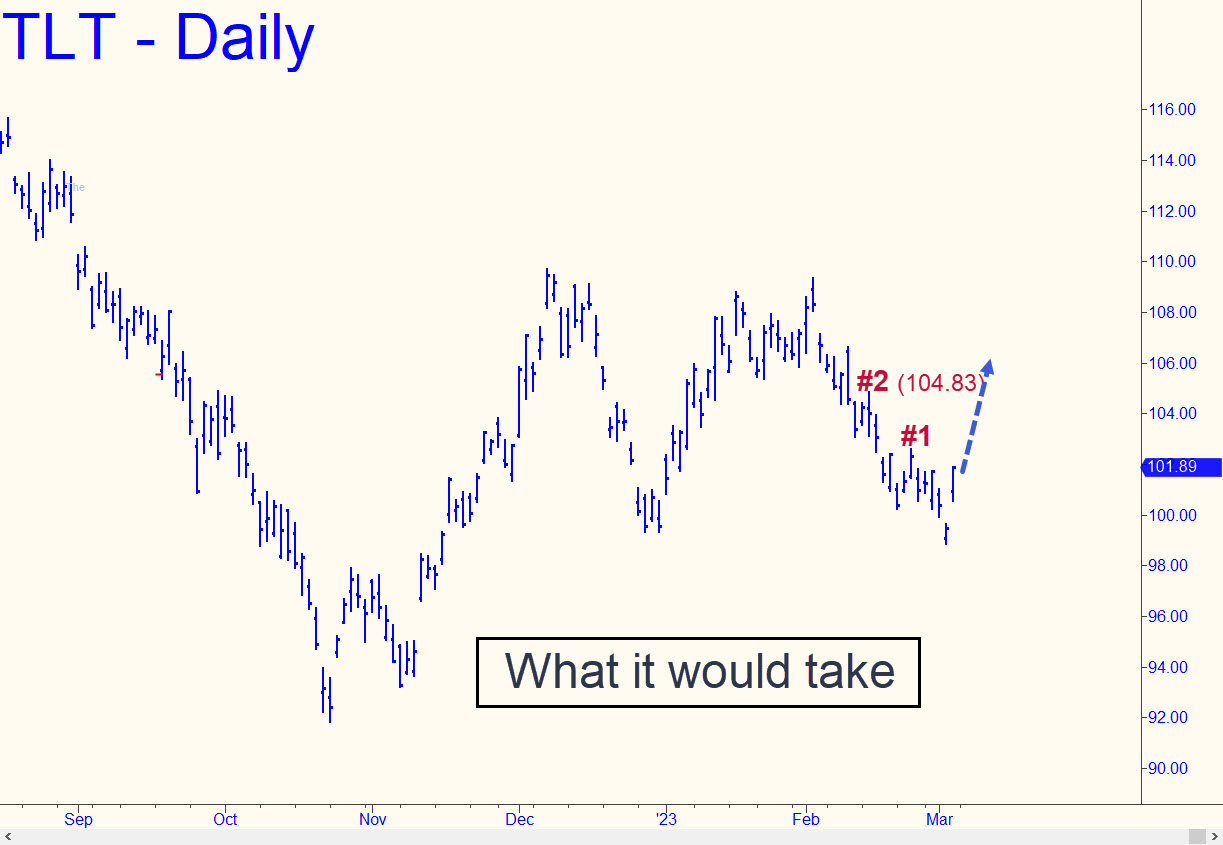 Last week’s goosing occurred in a place too obvious to be taken seriously. TLT opened Thursday on a gap beneath December’s double low at 99.35, shaking out the many bulls who were counting on the low for last-ditch support. Without their drag to burden the bounce that ensued, Friday saw a vertical climb that began with a short-squeeze gap well above the previous day’s close. The chart shows how far shy of persuasive the rally fell nonetheless, and what TLT must do before we can safely assume the bull market begun in October 2022 has resumed.