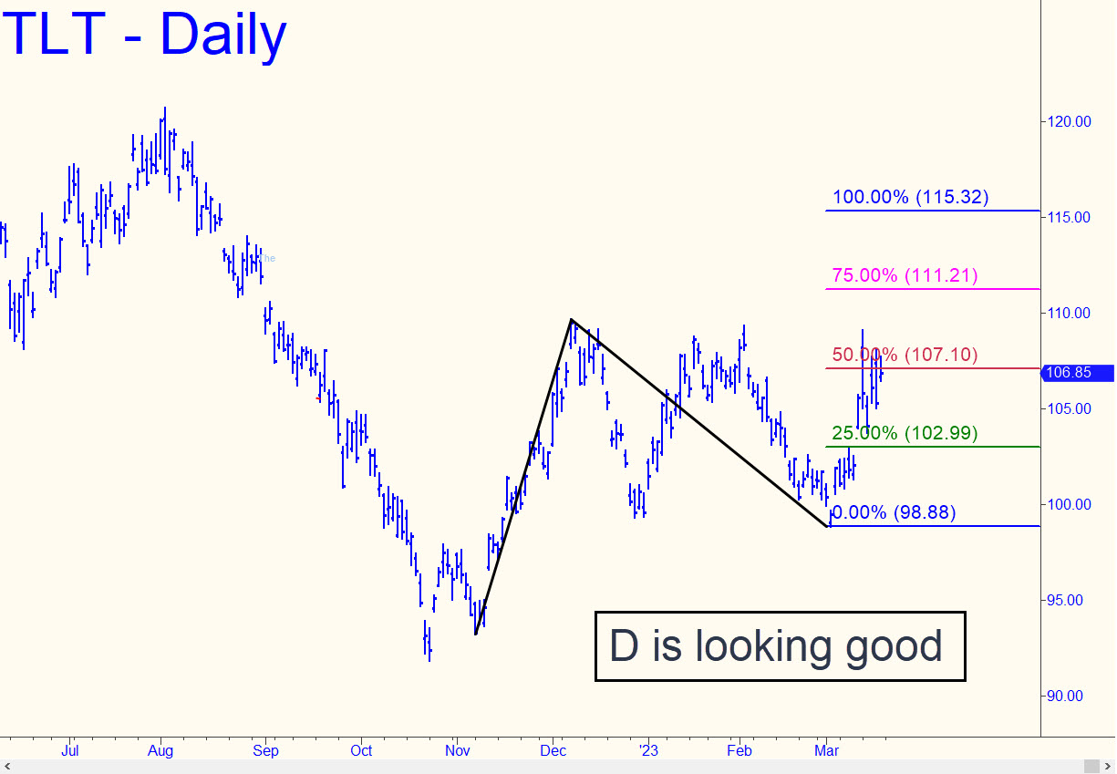TLT had a busy week clearing the way for a strong push to D=115.32. It started with a fist-pump past the midpoint ‘hidden’ resistance at 107.10. The breach was sufficient to suggest the target is about 75% likely to be achieved. The picture of strength brightened still more when the pullback from Monday’s upthrust failed to set up a ‘mechanical’ buy at the green line. Having fewer bulls aboard, and therefore less profit-taking, will always steepen the trajectory of a rally. For now, use p2=111.21 as a minimum upside projection for the near term. _______ UPDATE (Mar 25): No change. _______ UPDATE (Mar 31): Still no change, although TLT would trip a ‘mechanical’ buy if it were to feint down to x=102.99.
