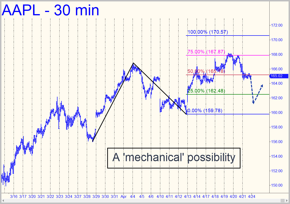 Our #1 bellwether spent the week screwing the pooch. Accordingly, I’ve adjusted our focus downward somewhat from the 176.52 rally target given here earlier. That is the D target of a much larger pattern. The less ambitious price objective is 170.57, and you should be prepared for a possible swoon to x=162.48, since that would trigger an enticing ‘mechanical’ buy. In the meantime, if you bought puts at the recent top that I’d signaled, you should cash out 25%-50% of your position. Swinging for the fences with put options hasn’t been a very good strategy in 2023. _______ UPDATE (Apr 26, 10:58 p.m.): The criminally engineered opening bar bottomed at 162.80, a hair above the 162.48 price I’d said would trigger a ‘mechanical’ buy. Anyone still holding puts? If so, please announce yourself in the chat room.
