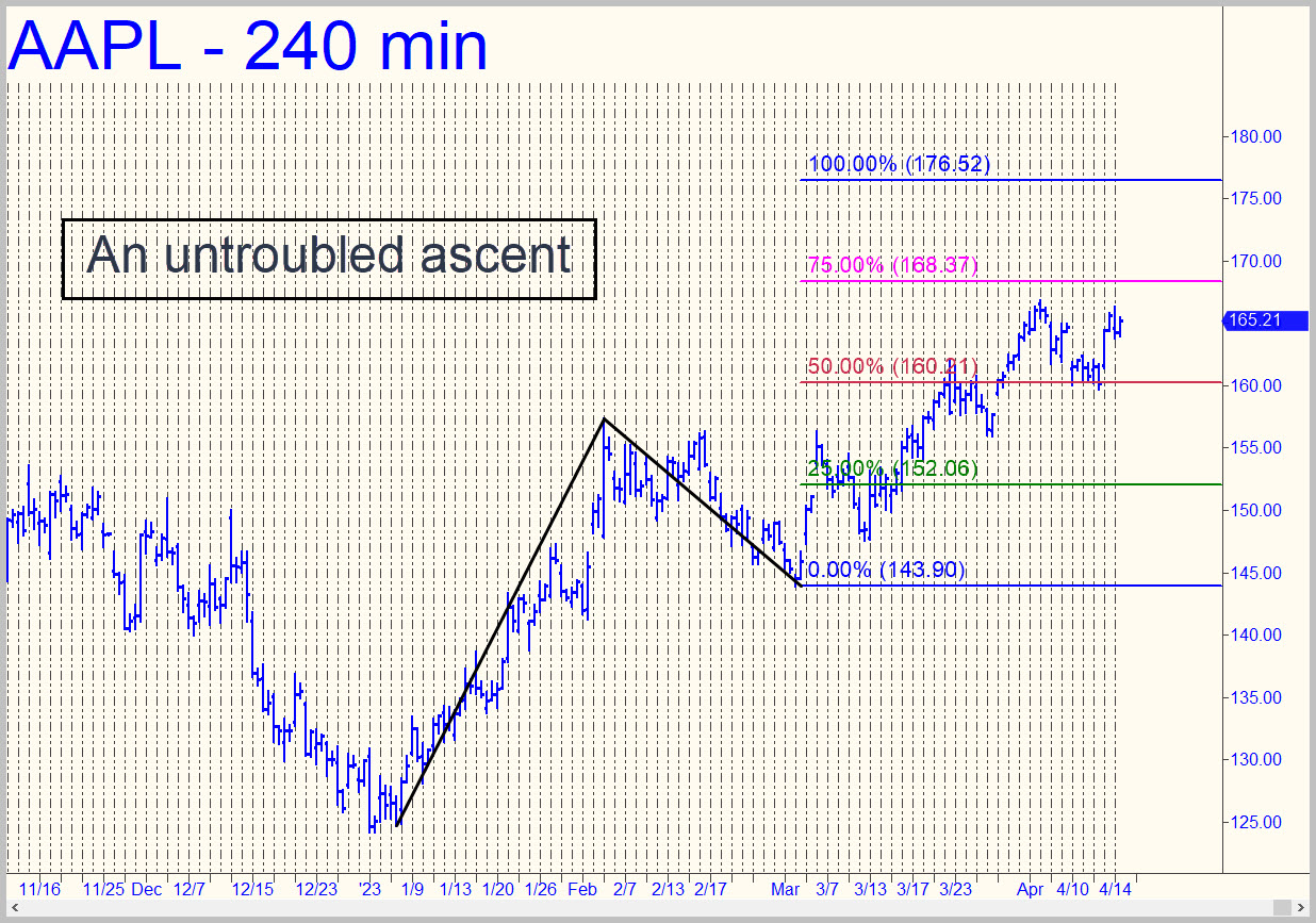 AAPL’s ascent toward a longstanding target at 176.52 has been untroubled, with no swoons ugly enough to enable a ‘mechanical’ buy on the way up. Nor has the rally been steep enough to make owning call options profitable. Selling them short has been the ticket, and that’s probably one reason the stock’s handlers have been content to get where they’re going slowly but surely. This is going to be little help to us, although there may be opportunities to place jackpot bets with options that sometimes get underpriced. Stay tuned if you care. ______ UPDATE (Apr 19, 2:14 p.m.): The stock is closing on double resistance that could be shortable. See the chat room discussion for further details. ______ UPDATE (Apr 20, 11:22 p.m.); The intraday short-squeezes and gap-up opening bars have turned so ferocious lately that you just know DaBoyz are trying to Mau-Mau bears before turning out the lights. Hang onto those puts!
