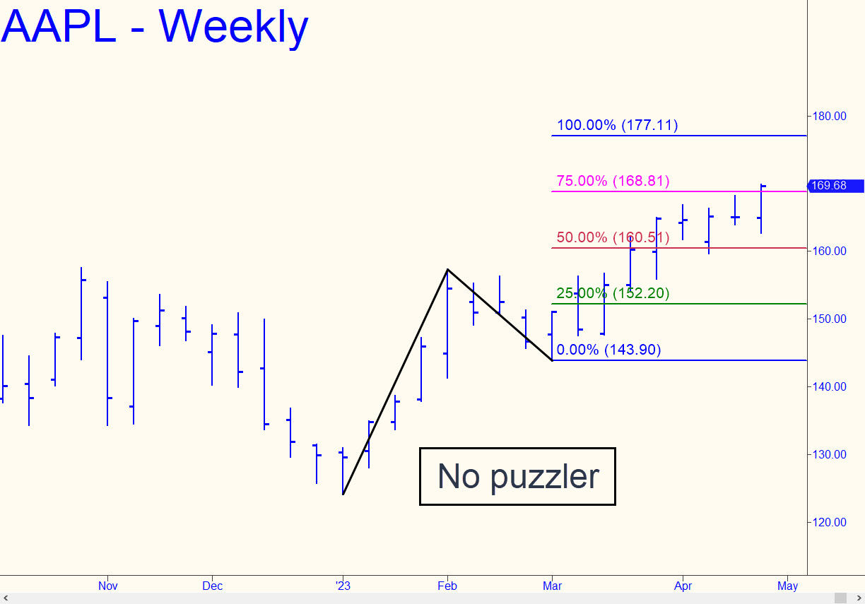 AAPL should be able to reach the 177.11 rally target easily, although that would imply a dearth of opportunities to get long ‘mechanically’ on a swoon. This is one instance where a ‘mechanical’ buy at the 160.51 red line (i.e., the midpoint Hidden Pivot) would be justified. Your bid there should be stopped at 154.87, yielding a risk/reward of 1:3 on entry that is predicated on exiting a long position at the 177.111 target.