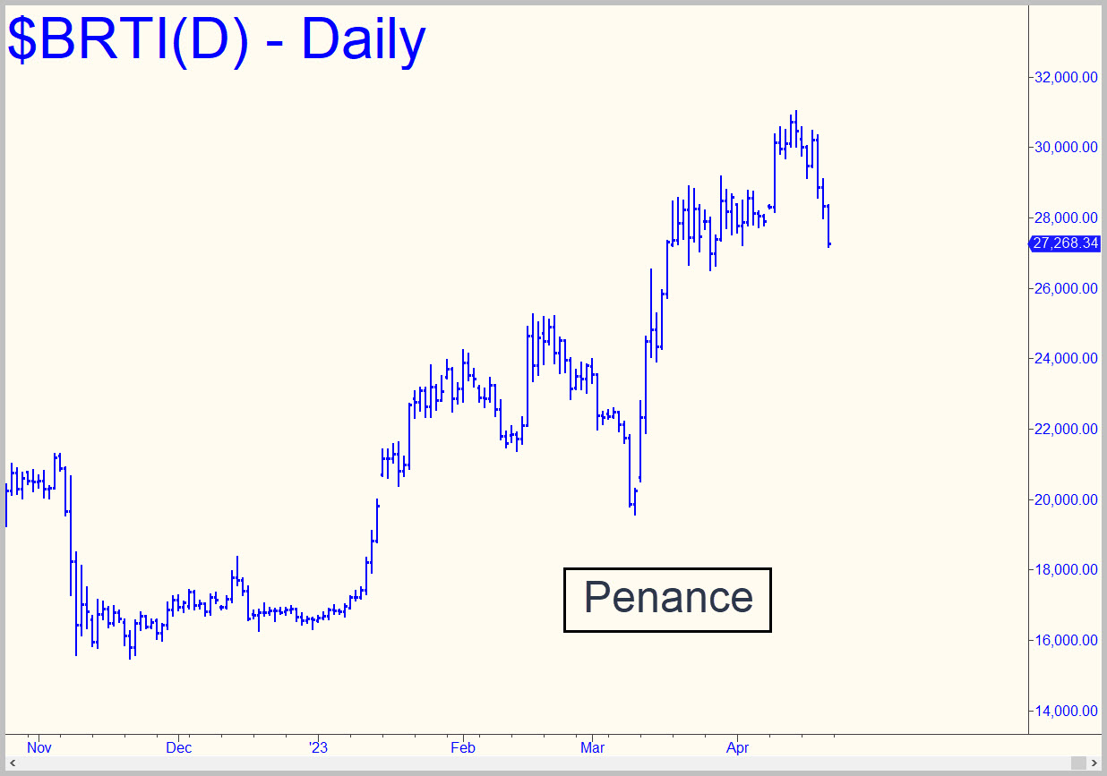 Bitcoin has been perfectly predictable for months, but I may remove it from the core list because my forecasts, which have been sensationally accurate, have attracted almost no discernible interest. I did get an email last week from a subscriber who said he has been enjoying Bertie touts, but apparently he’s the only one. I’ve continued to tout Bertie anyway in hopes of attracting some Robin Hoodies and their ilk; on second thought, however, who needs the little twerps? If you want to keep this symbol on the front page, let me know in the chat room or via email. If I hear from 25 subscribers who support it, it can stay. A voodoo ‘buy’ is imminent if this big-time hoax can get a 336-point bounce from a voodoo number that’s less than 400 points away. But so what, right? _______ UPDATE (Apr 26, 8:54 a.m.): Bertie is screaming this morning toward 30,277, using a reverse pattern on the daily chart where a= 27,732 on April 6. Alternative a/d= 27,243/30,766. The way the rally impaled p of either pattern implies there is nearly zero chance that both of these targets will NOT be achieved.